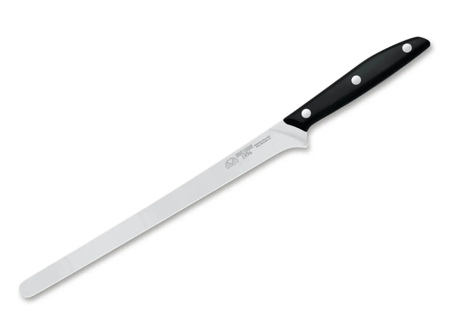 Mit der Serie 1896 stellt Due Cigni eine besonders hochwertige Küchenmesserserie vor, die das Sortiment des Herstellers aus der traditionellen Messerstadt Maniago krönt. Mit Griffen aus widerstandsfähigem POM liegt das Schinkenmesser ausgezeichnet in der Hand, wobei die klassische Vernietung die optische und haptische Balance perfektioniert. Für die Klingen kommt der bewährte X50CrMoV15 zum Einsatz, der Schnitthaltigkeit und Korrosionsresistenz perfekt vereint.