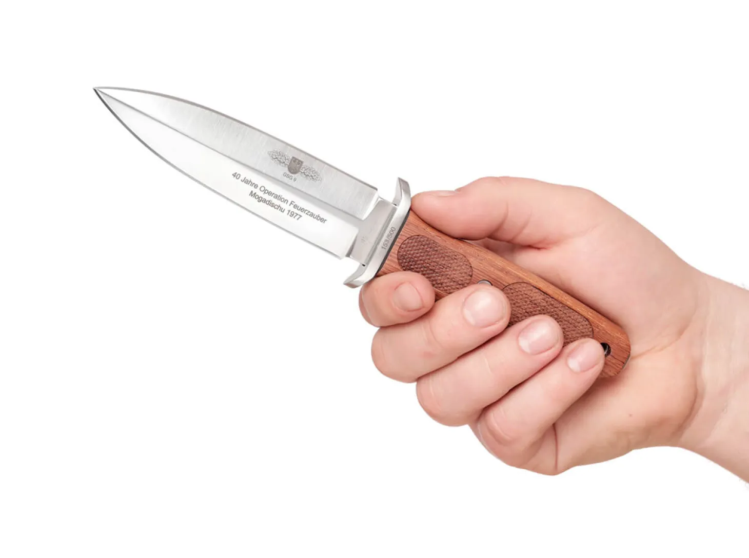 Im Herbst 2017 jährte sich die Befreiung der von Terroristen entführten Lufthansa-Maschine „Landshut“ in Mogadischu zum vierzigsten Mal. Durchgeführt wurde die Befreiungsaktion („Operation Feuerzauber“) von der damals noch recht jungen Einheit GSG 9, die sich, 1972 gegründet, mit diesem erfolgreichen Einsatz unter der Führung des Gründers Ulrich K. Wegener stark im Bewusstsein der Öffentlichkeit verankert hat. Und gerade in Zeiten wie den heutigen, in denen Terror fast schon allgegenwärtig zu sein scheint, kann einer Einheit wie der GSG 9 gar nicht genug Anerkennung und Hochachtung für ihren unermüdlichen Einsatz gegen Terrorismus und Schwerstkriminalität gezollt werden. Wir möchten die Einheit und ihre Mitglieder daher mit zwei Sondermodellen des A-F 4.5 und 5.5 ehren, die wir mit offizieller Genehmigung der GSG 9 auch mit dem Tätigkeitsabzeichen der Einheit, den berühmten Schwingen, versehen dürfen. Kaum ein anderer Messermacher hat das Feld der taktischen Einsatzmesser so sehr geprägt wie William H. „Bill“ Harsey, seine Entwürfe haben ihm einen ausgezeichneten Ruf in der Messerwelt eingebracht. Die von ihm entworfene Modifikation des legendären Böker Applegate-Fairbairn verbindet das von vielen Eliteeinheiten im Einsatz genutze Messer mit modernen Elementen. Um der Aktion auch eine Wirkung jenseits des Symbolischen zu verleihen, spendet Böker von jedem verkauften Exemplar 5 Euro an von der GSG 9 benannte wohltätige Organisationen. Ausgestattet sind die Messer mit einer fein satinierten Klinge und Edelstahlknebel, wobei die Schwingen der GSG 9 auf der Klinge verewigt werden. Der Griff wird aus zertifiziert importiertem Palisander gefräst und weist das charakteristische Rillenprofil für maximale Griffigkeit auf. Die Auslieferung erfolgt mit einer hochwertigen schwarzen Lederscheide. Limitiert auf 500 Stück weltweit pro Modell und individuell nummeriert.