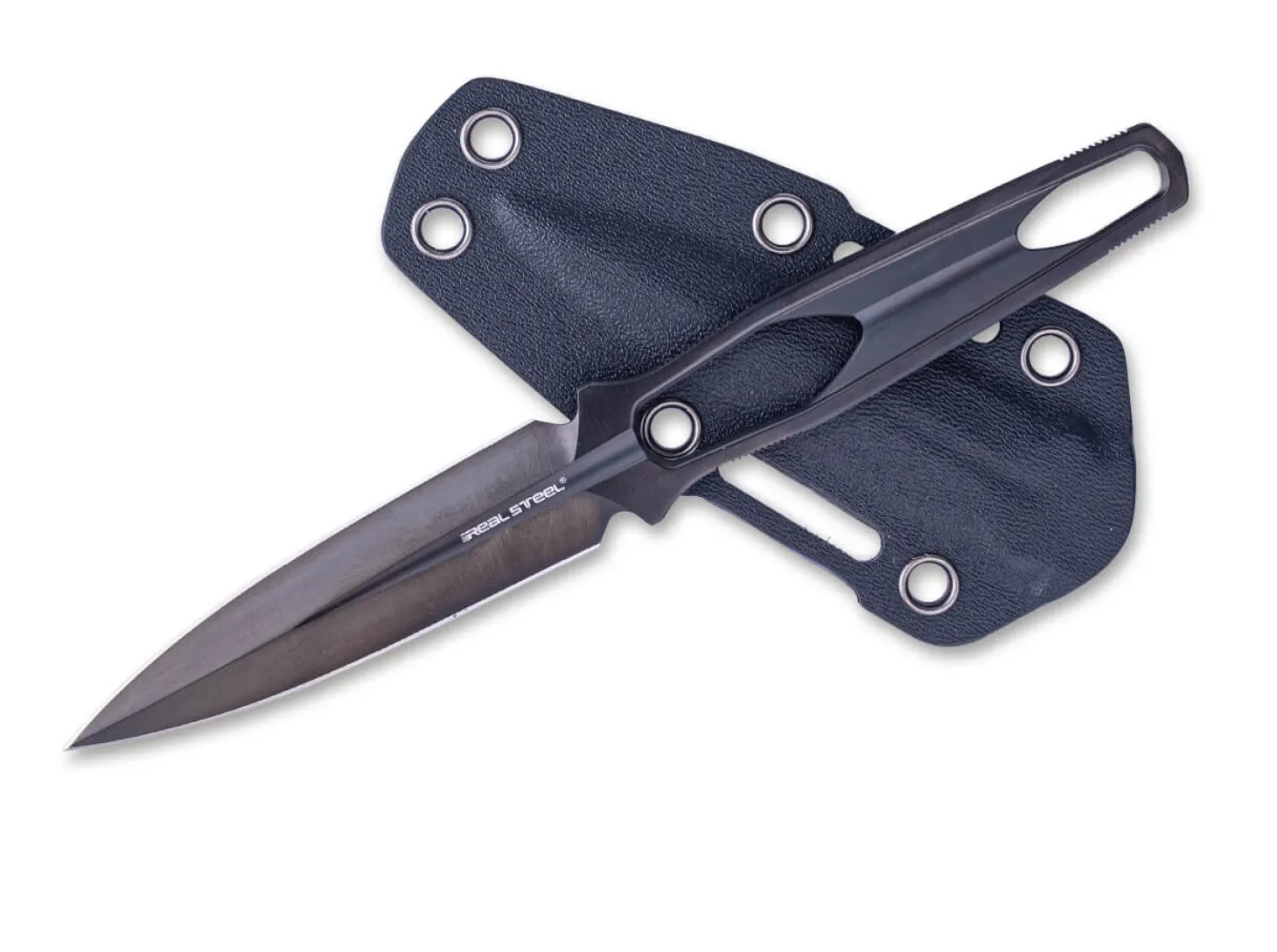 Der taktische Dolch aus der Feder von Ostap Hel ist mit einer beidseitig abgezogenen Spearpoint-Klinge aus K110 sowie einem schwarzen DLC-Finish zum Schutz vor Kratzern und zur Verminderung von Reflexionen. Geliefert wird das als Ganzstahlkonstruktion konzipierte Skelettmesser in einer passgenauen Kydexscheide.