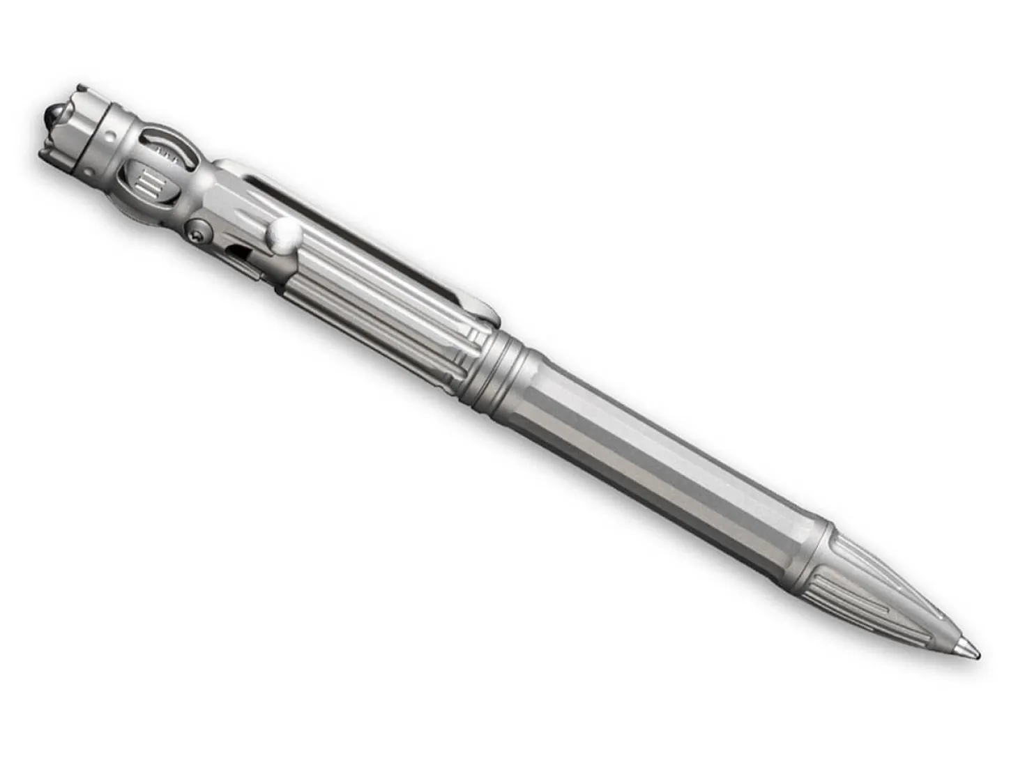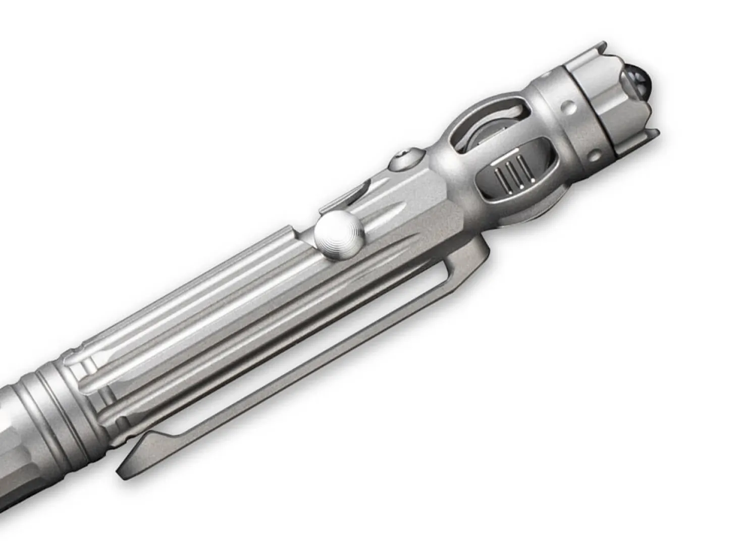 In Anlehnung an den mittelalterlichen Baculus, einem dem Zepter ähnlicher Streitkolben, präsentiert WE Knife den gleichnamigen Tactical Pen. Der aus Titan gefertigte Stift ist aber hingegen genügsam gestimmt und beruhigt strapazierte Nerven mit dem integrierten Rotations-Spinner im oberen Bereich des Griffs. Den krönenden Abschluss bildet der Glasbrecher am Griffende. Verwendet werden Minen des Typs Schmidt EasyFLOW 9000M oder vergleichbar.