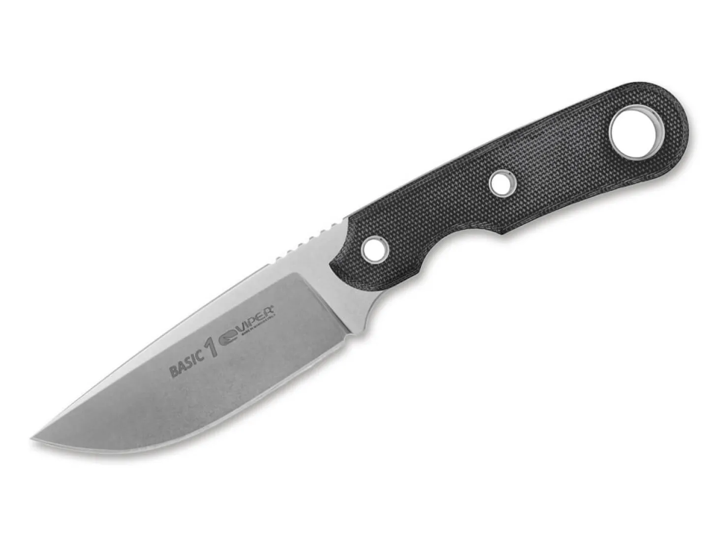 Reduziert auf das Wesentliche, gemacht für wesentlich mehr! Das Viper Basic 1 von Tommaso Rumici verleiht dem Alltag die nötige Portion Abenteuer als zuverlässiger Partner für Bushcrafting, Camping und die kleinen täglichen Aufgaben. Das feststehende Messer mit Droppoint-Klinge aus D2 lässt beim Schneiden von Kartons bis hin zu kleinen Ästen die Leichtigkeit des Seins erkennen. Diese setzt sich in den schlanken Linien fort, die im ergonomischen Griff aus schwarzem Micarta und den drei großen Hohlnieten Ausdruck finden. Dank Vollerl und Jimpings garantiert das Messer Stabilität und eine sichere Handhabung. Lieferung mit Kydexscheide und passendem Tek-Lok Gürtelclip.