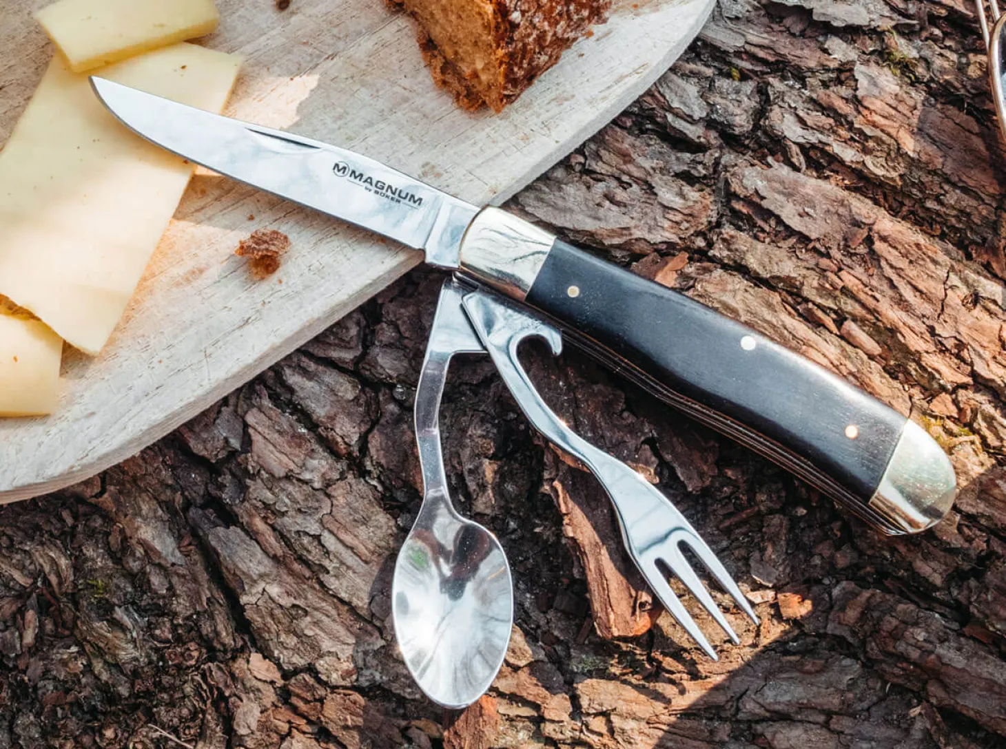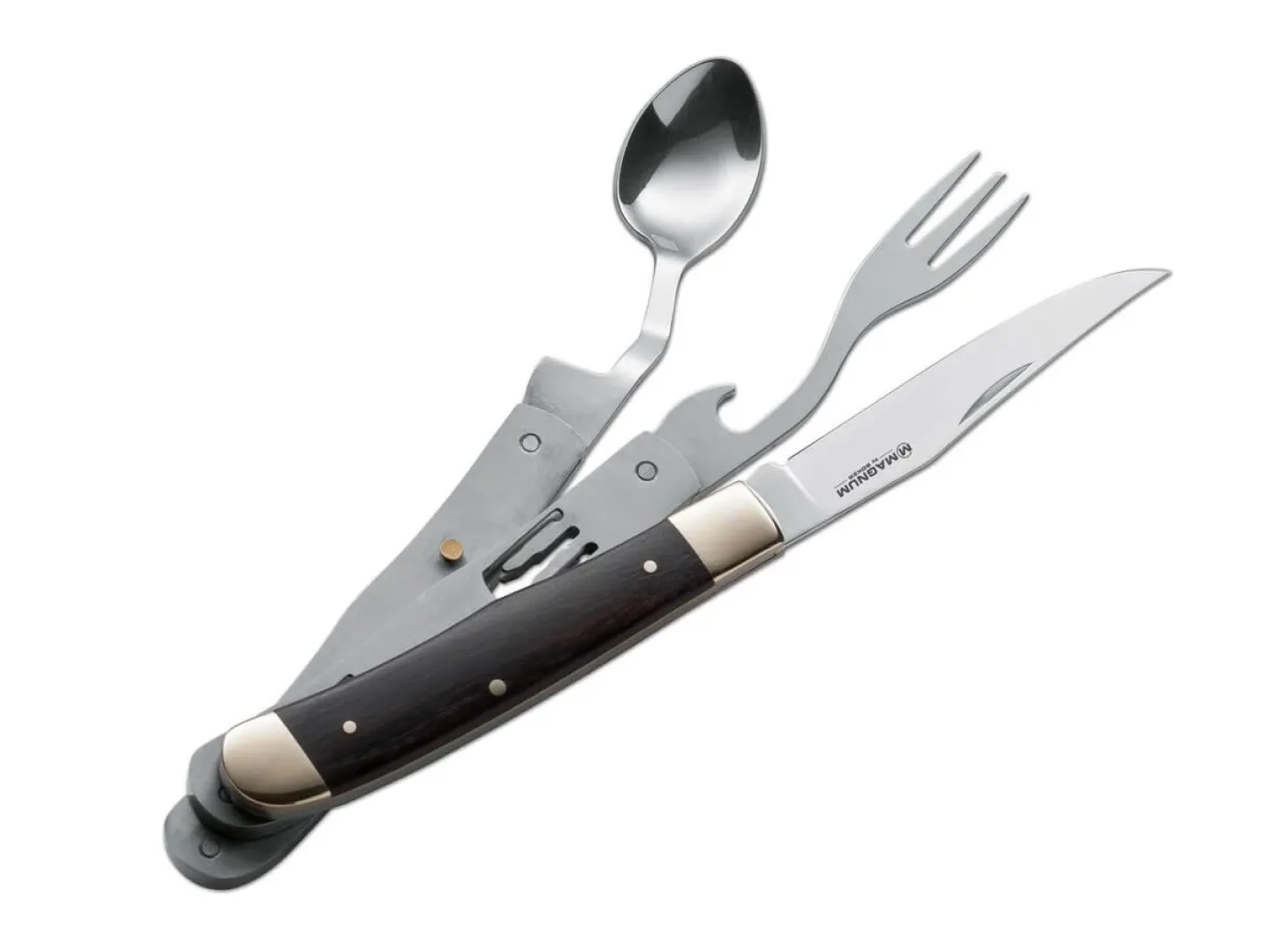 Das Magnum Bon Appetite ist ein kompaktes und vollwertiges Camping-Besteck. Messer, Gabel und Löffel werden aus 440er Stahl gefertigt und sind dank einer innovativen Verschlusstechnik getrennt voneinander einsetzbar. Der Nagelhau garantiert einfaches Öffnen und Schließen des Taschenmessers. Die messingfarbenen Backen in Verbindung mit den dunkelbraunen Griffschalen aus Schichtholz runden das Gesamtpaket ab.