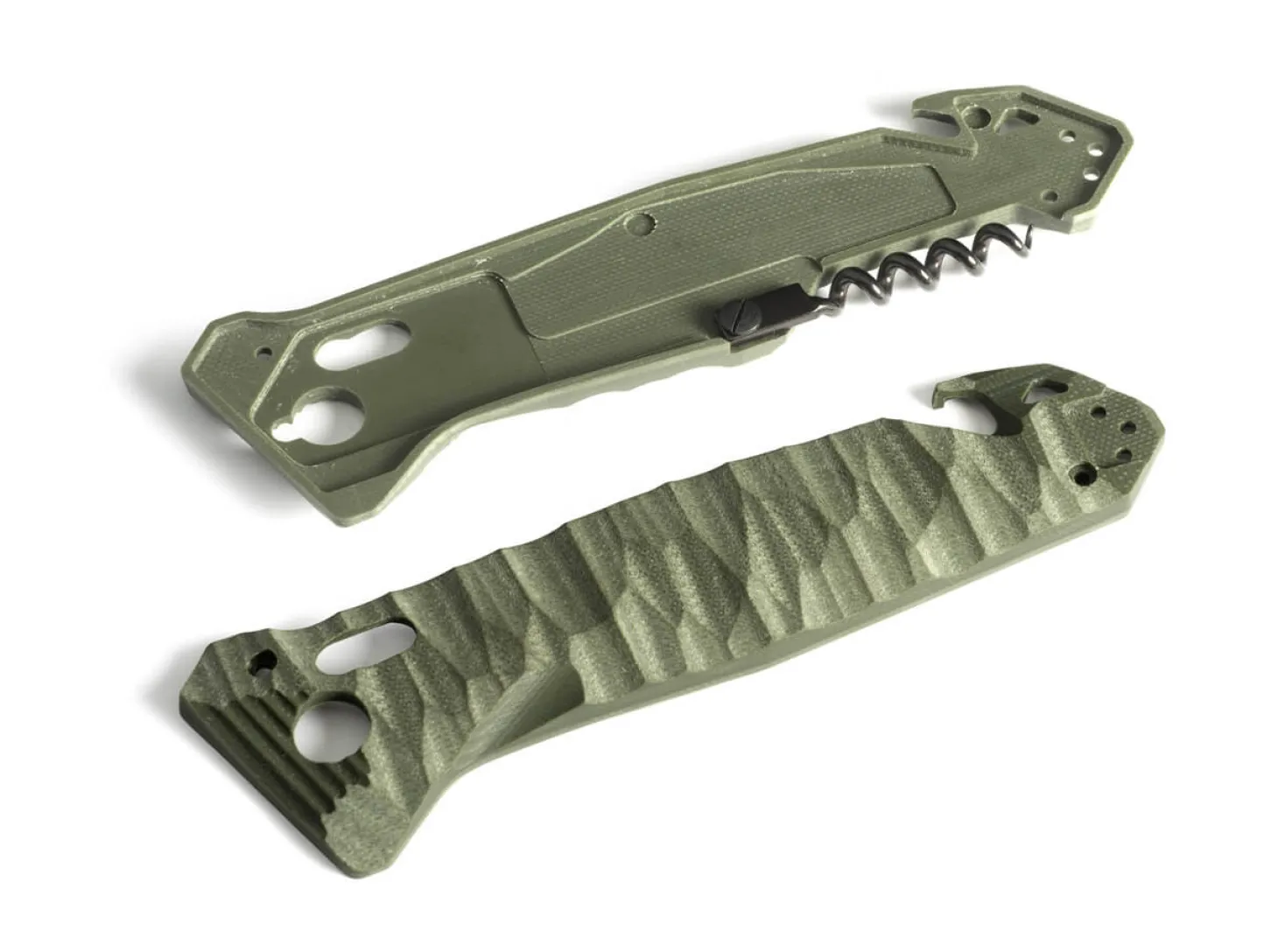 Maßgeschneiderte Griffschalen aus G10 mit außergewöhnlichem Grip für die taktischen Messer der CAC-Reihe von TB Outdoor. Hohe Festigkeit und Leichtigkeit durch gezielten Einsatz von Glasfaserschichten. Mit vormontiertem Korkenzieher.