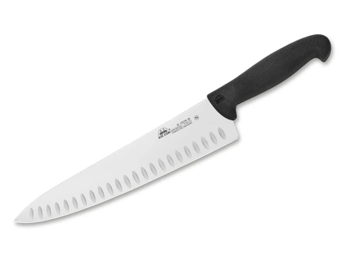 Das widerstandsfähige Chefmesser von Due Cigni eignet sich perfekt für den Einsatz in der Metzgerei und der professionellen Küche. Dank des feuchtigkeitsresistenten Griffs aus schwarzem Kunststoff kann das Messer auch in der Gastronomie bedenkenlos eingesetzt werden. Die hochwertige Nitro-B Klinge ist mit Kullen versehen, mit ihr lässt sich insbesondere Fleisch sehr leichtgängig verarbeiten.