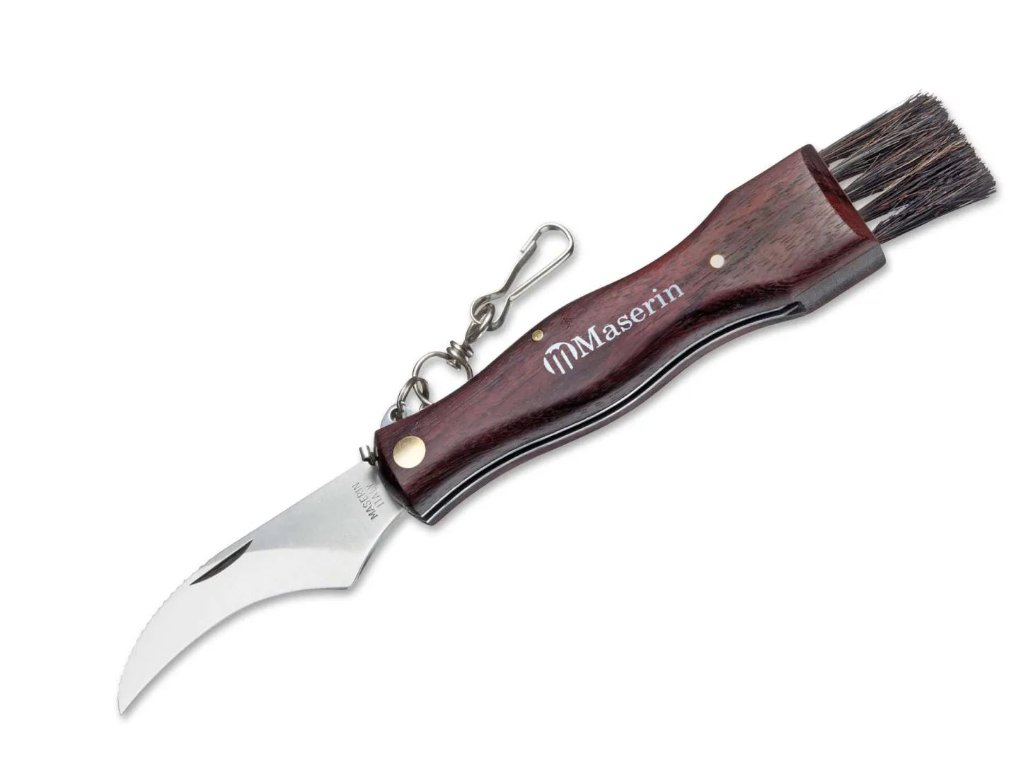 Nicht nur in Italien ist das Sammeln von Pilzen ein beliebtes Hobby. Das typische Pilzmesser verfügt über eine gebogene Klinge, mit denen der Stiel knapp über dem Boden abgeschnitten wird. Ebenso charakteristisch ist die praktische Bürste aus Naturborsten am Ende des Griffes aus Palisanderholz, mit der die Pilze gereinigt werden. Mit Pinzette zum Entfernen von Verschmutzungen und Kette mit Karabiner.