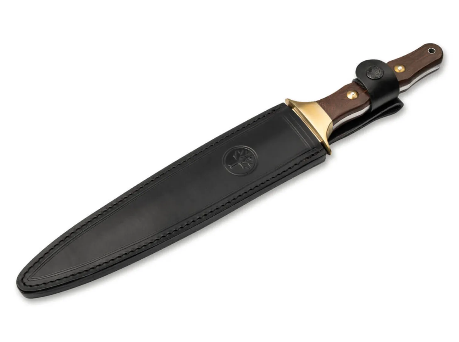 Das Böker Arbolito Colmillo ist als klassischer Hirschfänger mit einer langen Dolchklinge ausgestattet und beeindruckt mit seiner stabilen Vollerl-Konstruktion und seiner beachtlichen Größe selbst erfahrene Jäger. Die beidseitig abgezogene Klinge aus ACX 390 ist mit einem feinen Satin-Finish versehen, der ausladende Handschutz besteht aus Neusilber. Für die ergonomisch geformten Griffschalen kommt edles Guayacan-Ebenholz zum Einsatz, das die traditionelle Anmutung des Messers zusätzlich unterstreicht. Mit Fangriemenöse und hochwertiger Gürtelscheide aus braunem Leder.