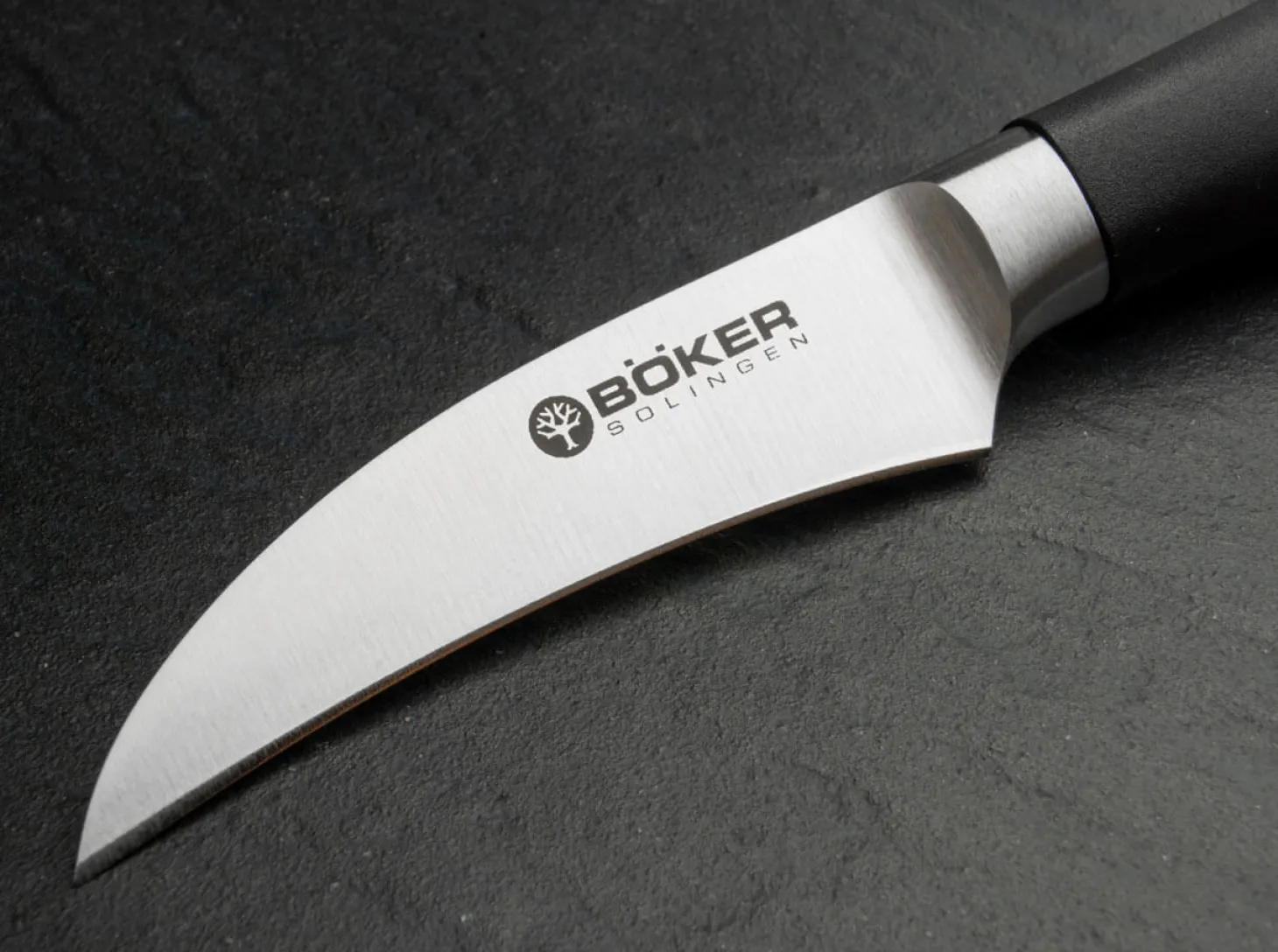 Was haben Trier, Wiesbaden, Münster und Lüneburg gemeinsam? Neben historischen Stadtkernen, überregionalen Sehenswürdigkeiten und einer langen Tradition als bedeutende Handelsstädte vor allem eines: Sie beherbergen exzellent geführte Stahlwarenhändler, die sich durch ein breites Warenangebot und eine hohe Fach- und Beratungskompetenz seit vielen Jahren einen Namen gemacht haben.Die jahrzehntelange Erfahrung, das ausgezeichnete Know-How und das tagtäglich im Geschäftsalltag bewiesene Gespür für die Anforderungen und Bedürfnisse von koch- und küchenbegeisterten Kunden haben wir uns zunutze gemacht und gemeinsam mit unserer fast 150-jährige Erfahrung als Solinger Messermanufaktur in die Produktentwicklung der Böker Core Professional Serie fließen zu lassen. Entstanden ist ein Produkt, welches sich aufgrund der dynamischen Linienführung, dem hervorragenden Handling und der atemberaubenden Schneidfähigkeiten das Prädikat „Empfohlen von führenden Fachhändlern“ mehr als verdient hat.Der massive Klingenrohling aus der für hochwertige Küchenmesser exzellent geeigneten Chrom-Molybdän-Vanadium- Legierung (X50CrMoV15) wird durch die aufwändige Schmiedung in Solinger Handarbeit zusätzlich im Gefüge optimiert und anschließend auf 58 HRC gehärtet. Für eine längere Standzeit der Klinge und ein noch feineres Schnittbild wird der bei uns übliche traditionelle Handabzug zusätzlich hochglanzpoliert.Der geschmiedete Kropf bietet jederzeit einen sicheren Griff und schützt bei einem Abrutschen vor möglichen Verletzungen. Als besonderes Design-Feature ist der Klingenrücken bei allen Messern dieser Serie sanft abgerundet. So liegt das Messer in jeder Griffposition angenehm in der Hand und verhindert auch bei stärkerem Druck auf den Klingenrücken im Wiegeschnitt ein unangenehmes Druckgefühl in der Hand.Die praktischen und perfekt proportionierten Griffe aus Kunststoff vervollständigen das stimmige Gesamtbild. So sind die Messer im höchsten Maße feuchtigkeitsresistent und können auch in der professionellen Gastronomie bedenkenlos eingesetzt werden. Denn gerade in der Küche hat die Hygiene jederzeit höchste Ansprüche zu erfüllen.Das Schälmesser ist besonders handlich und verfügt über eine kurze Klinge. Alle kleineren Arbeiten in der Küche werden mit diesem Messer durchgeführt. Zu den Hauptaufgaben gehört, wie der Name schon sagt, das Schälen von Obst und Gemüse. Es ist perfekt geeignet, um dicht an der Schale entlangzuschneiden.