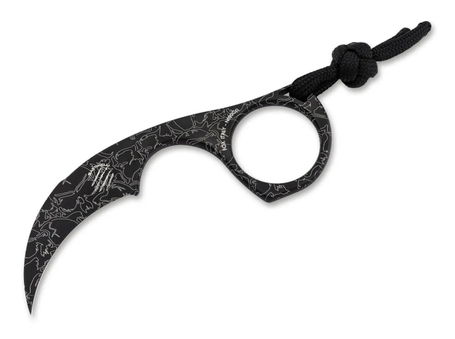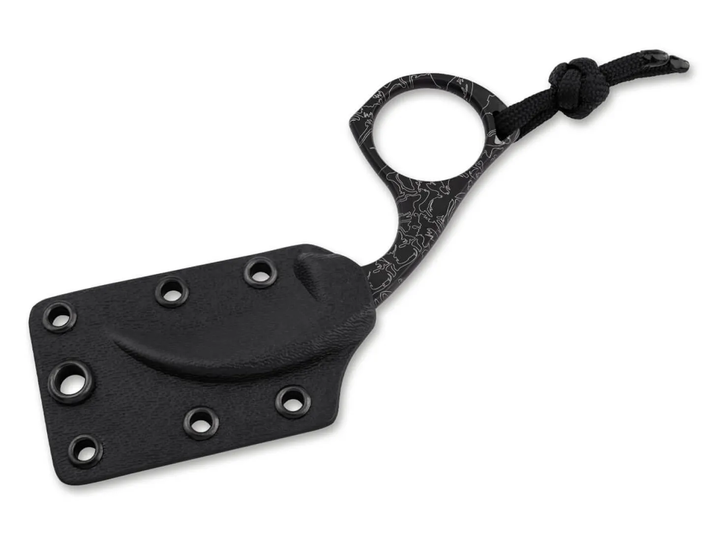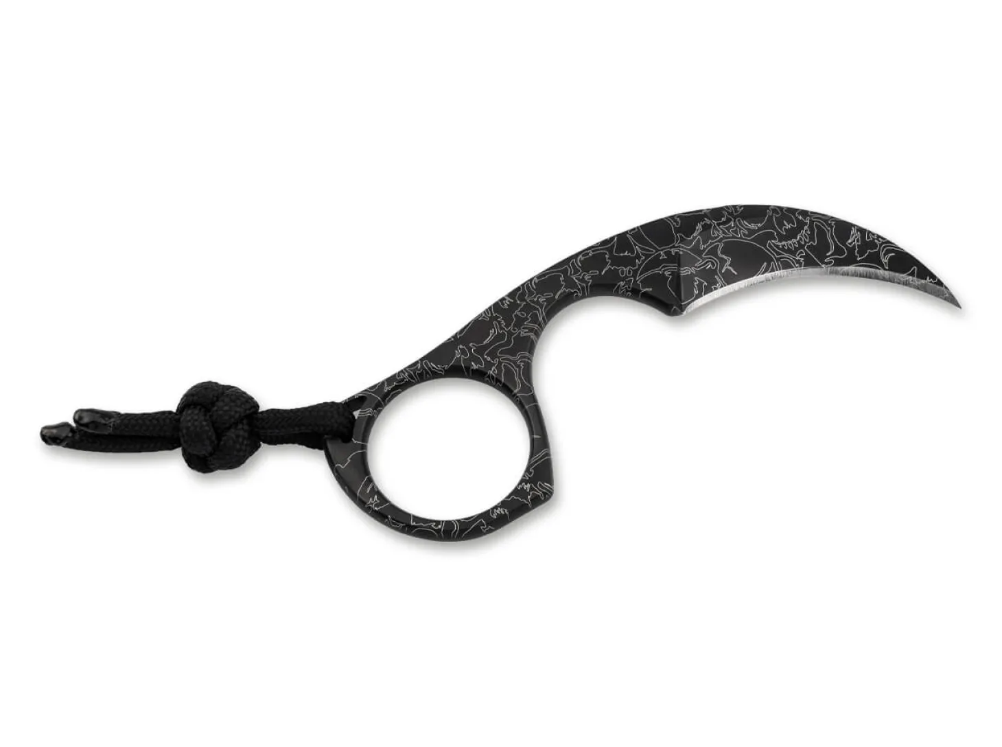 Das Diagnostic ist ein handliches Karambit Neck Knife mit Chisel Grind von Bastinelli. Die Edelstahlkonstruktion aus N690 mit schwarzem PVD-Finish ist mit einem geheimnisumwobenen Totenkopf-Design versehen. Das Daumenloch und die strukturierte Auflagefläche am Klingenrücken garantieren optimale Kontrolle beim Schneiden. Lieferung mit praktischer Kydexscheide sowie Lanyard.
