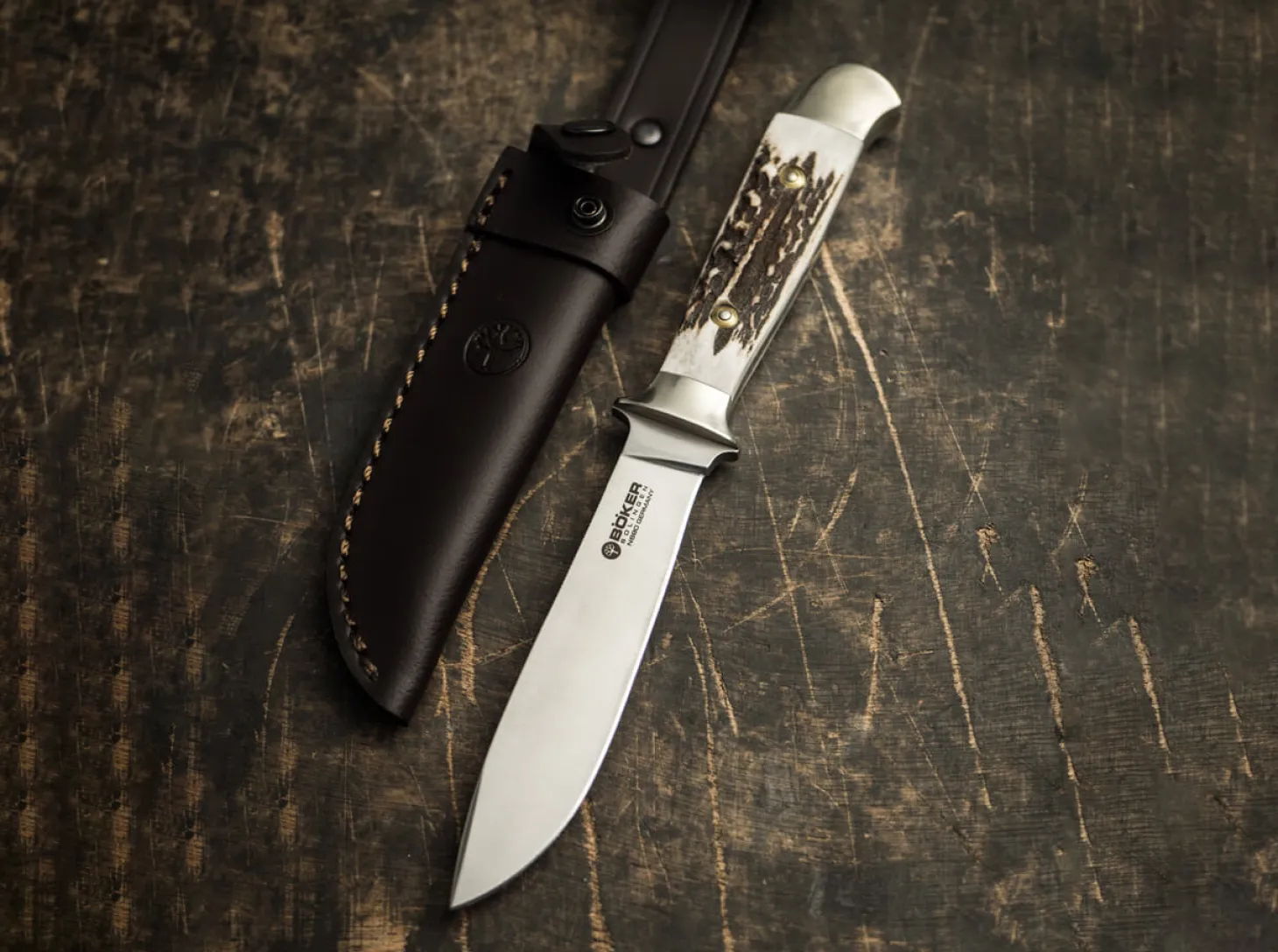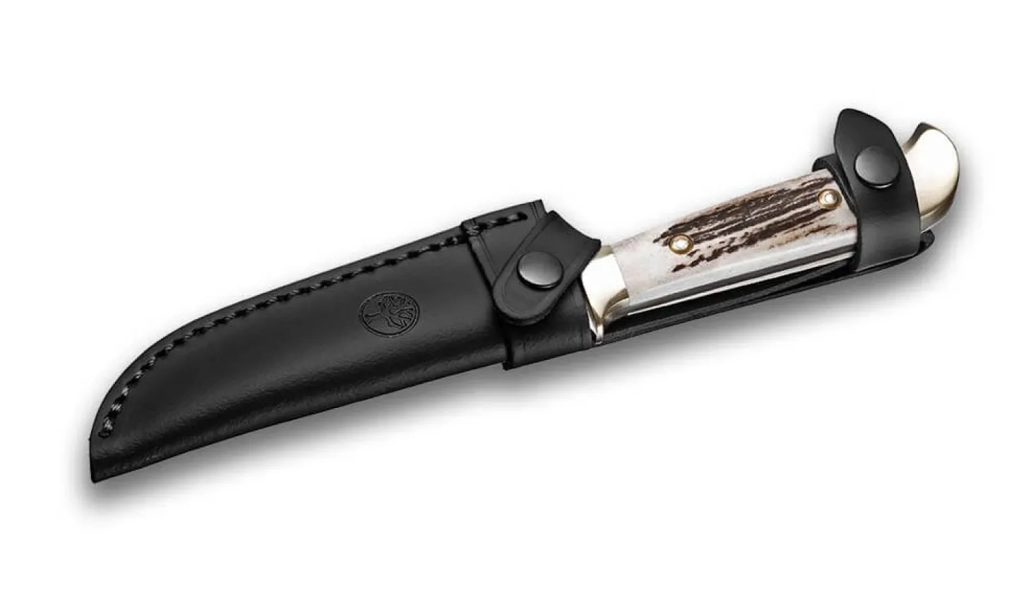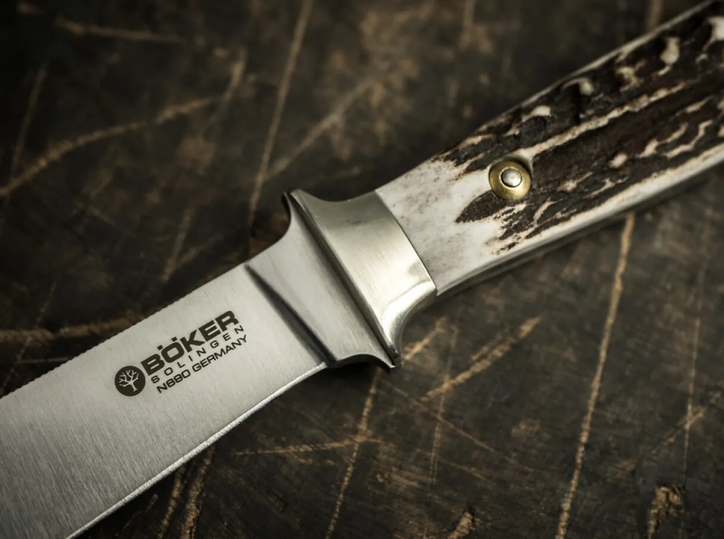 Mit dem Böker Försternicker besinnen wir uns eindeutig auf alte Werte, denn diese traditionelle Variante des Nickers hat sich schon vor Jahrzehnten auch in unserem Programm großer Beliebtheit erfreut. Die etwas breitere, leicht bauchige Klinge ist kennzeichnend für diese spezielle Bauform und bietet ein etwas vielseitigeres Einsatzspektrum als die klassisch spitz zulaufenden Jagdnicker. Der gerundete Klingenrücken mit der dezenten Daumenriffelung erhöht den Griffkomfort und betont die Exklusivität des Messers.So empfiehlt sich der Försternicker für alle möglichen anfallenden Arbeiten im Revier, denn die sehr kräftig ausgelegte Klinge kombiniert durch den hohen Flachschliff Stabilität mit ausgezeichneten Schneideigenschaften. Die Verwendung des modernen Böhler N690 als Klingenstahl unterstreicht den hohen Nutzwert durch die überlegene Schnitthaltigkeit im Vergleich zu klassischen Nickerstählen und ist dennoch leicht nachschärfbar.Mit Neusilberbacke und -abschlussknauf liegt der Försternicker ausgezeichnet in der Hand, und die ebenfalls klassisch gehaltene Nickerscheide ermöglicht das problemlose Führen. Mit einer Beschalung aus ausgesuchtem Hirschhorn.
