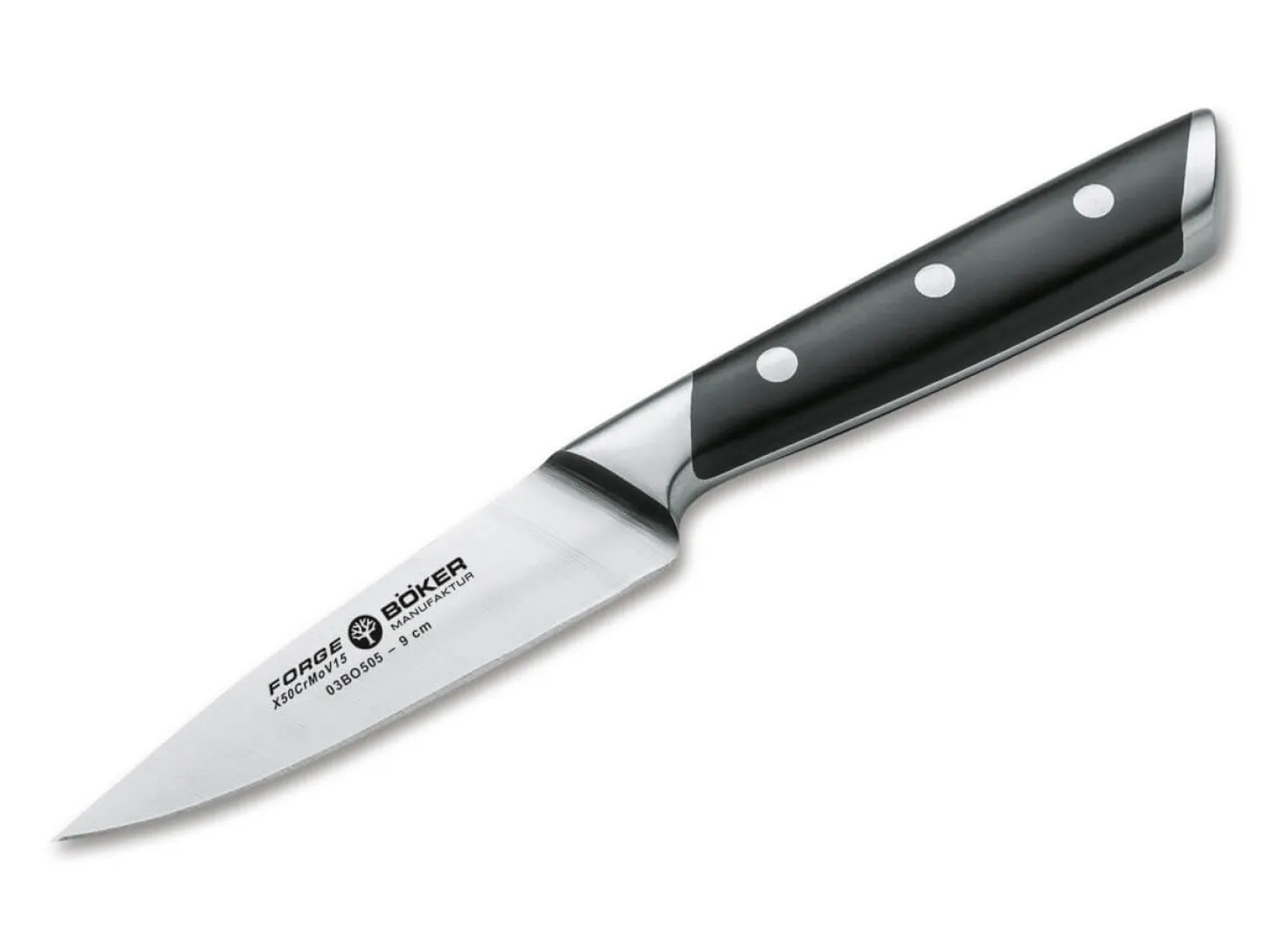 Die Kochmesser-Serie Böker Forge verbindet innovative und dynamische Formgebung mit klassischer Materialauswahl in Premiumqualität. Auffallend ist die attraktive Linienführung, die die Messer deutlich von der Masse der herkömmlichen Küchenmesser abhebt, ohne zu exzentrisch zu wirken. Darüber hinaus überzeugt die Serie Böker Forge mit einem ausgesprochen attraktiven Preis-Leistungs-Verhältnis. Die aus dem Chrom-Molybdän-Vanadium Edelstahl X50CrMoV15 gefertigten Messer sind optimal ausbalanciert und liegen durch die ergonomische Griffgestaltung perfekt in der Hand. Schwarze Griffschalen aus hochwertigem Spezialkunststoff werden klassisch mit drei Edelstahlnieten dauerhaft und ohne Fugen mit dem vollständig durchgehendem Messererl verbunden. Die Gestaltung der Klingen samt Übergang zum Kropf erlaubt ein problemloses Nachschärfen und gewährleistet in Kombination mit der richtigen Pflege eine langfristig perfekte Funktion der Messer. Bitte reinigen Sie die Messer nur per Handwäsche und nicht in der Spülmaschine. Darüber hinaus überzeugt die Serie Böker Forge mit einem ausgesprochen attraktiven Preis-Leistungs-Verhältnis. Die Auslieferung der Messer erfolgt in einer hochwertigen Geschenkverpackung.Das Schälmesser ist besonders handlich und verfügt über eine kurze Klinge. Alle kleineren Arbeiten in der Küche werden mit diesem Messer durchgeführt. Zu den Hauptaufgaben gehört, wie der Name schon sagt, das Schälen von Obst und Gemüse. Es ist perfekt geeignet, um dicht an der Schale entlangzuschneiden.