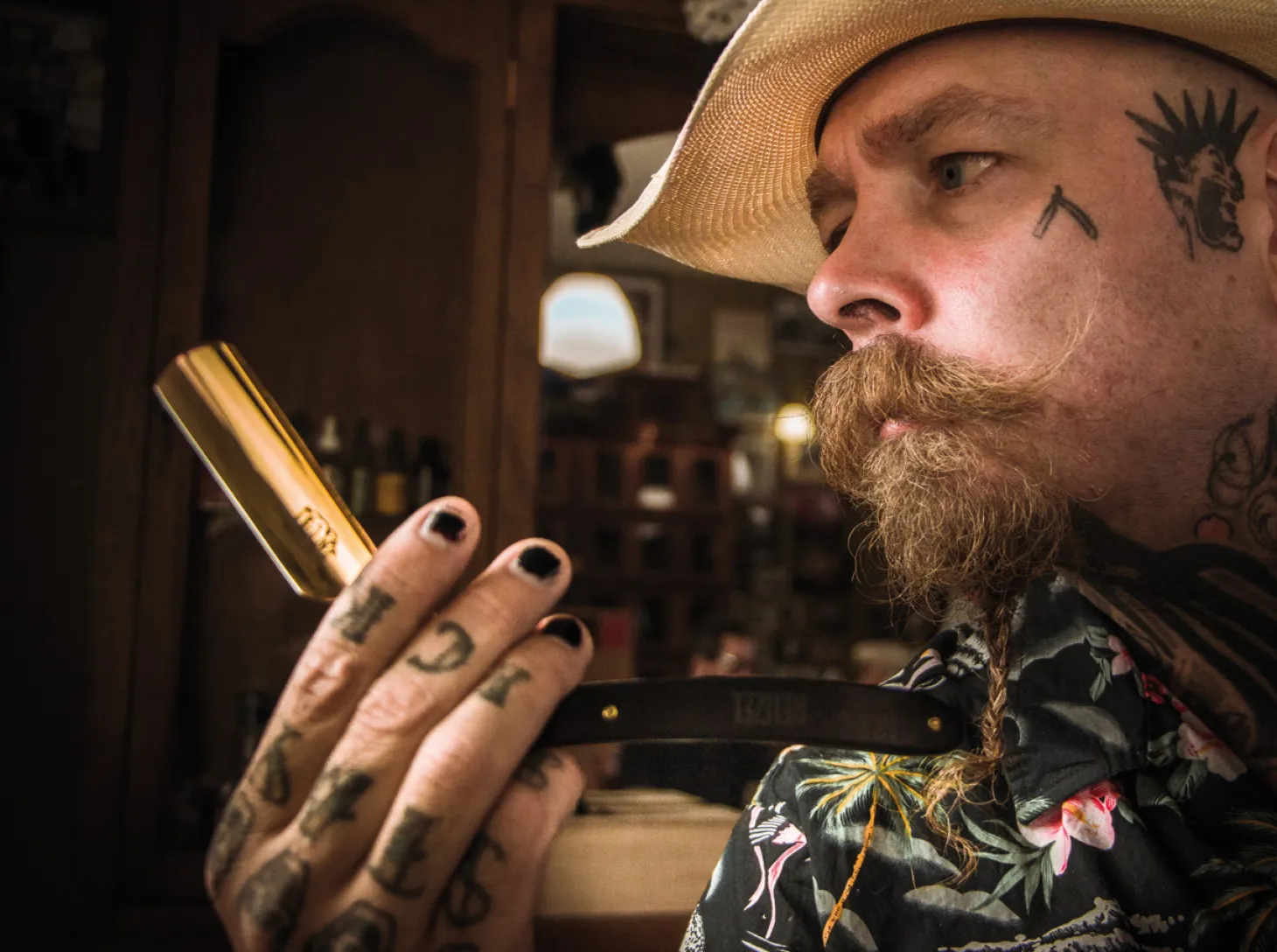 Wer Teil der Szene ist, kennt sie unweigerlich. Ob von Fotos in Zeitschriften oder als Big-Head- Figuren im Barbershop, Leen und Bertus sind allgegenwärtig. Ebenso dienen ihre beiden Poster mit den „Signature Haircuts“ und den „Barbershop Classics“ Barbieren weltweit als Inspiration und Orientierung beim Frisieren. Und natürlich Reuzel, „Hollands Finest Pomade“. Die charakteristischen Vintage-Blechdosen mit dem derben Schwein als Markenzeichen sind einzigartig und nicht zu übersehen.Dabei hat alles klein angefangen, mit dem Barbershop „Schorem“ im Nieuwe Binnenweg in Rotterdam, in dem auch heute noch alles beim Alten ist. „Schorem“ heißt so viel wie Lumpengesindel, und „Reuzel“ ist schlicht mit Schweineschmalz zu übersetzen. Das gibt schon Einblick in Leens und Bertus‘ Art von Humor und ihre lockere Art, geschäftliche Dinge anzugehen. Als sie das Ladenlokal renovierten, wusste niemand, dass hier ein Barbershop entstehen würde. Die Schaufenster waren noch mit Papier abgeklebt, und es war bereits ein Schild angebracht mit der Aufschrift „Männer, Hunde – keine Frauen“. Damit waren Sie natürlich bereits vor der Eröffnung das Stadtgespräch Nummer Eins.Zwei Wochen nach der Eröffnung war die Wartezeit bereits auf 5 Stunden angestiegen. Die Kunden stellen sich an manchen Tagen bereits um 6 Uhr in die Schlange, wenn Schorem um 10:00 öffnet. Dennoch arbeitet der Shop bis heute ohne Termin, und das gehört ganz klar zum Erlebnis. Man tauscht Geschichten aus und trinkt Bier oder den besten Filterkaffee der Stadt, während man auf seinen Schnitt wartet.Von Anfang an waren Leen und Bertus nicht geizig mit ihrem Wissen. Ihre Tutorials über die einzelnen klassischen Herrenhaarschnitte sind daher auch auf Youtube zu finden. Als der Bedarf für eine professionelle Wissensvermittlung immer größer wurde, haben sie kurzerhand schräg gegenüber von Schorem auf der anderen Straßenseite die Old School Barber Academy eröffnet.Nicht nur Leen und Bertus sind echte Hingucker, ihr limitiertes Sondermodell ist es selbstverständlich auch. Ein absoluter Blickfang ist die Beschichtung aus 24-karätigem Gold der geschwungenen 6/8 Zoll breiten Klinge mit zwei Fasen auf dem Klingenrücken. Die Vergoldung setzt nicht nur einen besonderen Akzent, sondern bietet auch einen barbierfreundlichen Korrosionsschutz des nicht rostfreien Kohlstoffstahls. Einen stimmigen Kontrast zur Klinge und zu den Nieten aus Messing bildet das Heft aus exklusiv zertifiziert Importierte Ebenholz. Veredelt wird das Heft mit dem bekannten REUZEL-Schriftzug, der filigran eingearbeitet wird. Auslieferung in historischer Verpackung mit Echtheitszer tifikat und individueller Seriennummer.