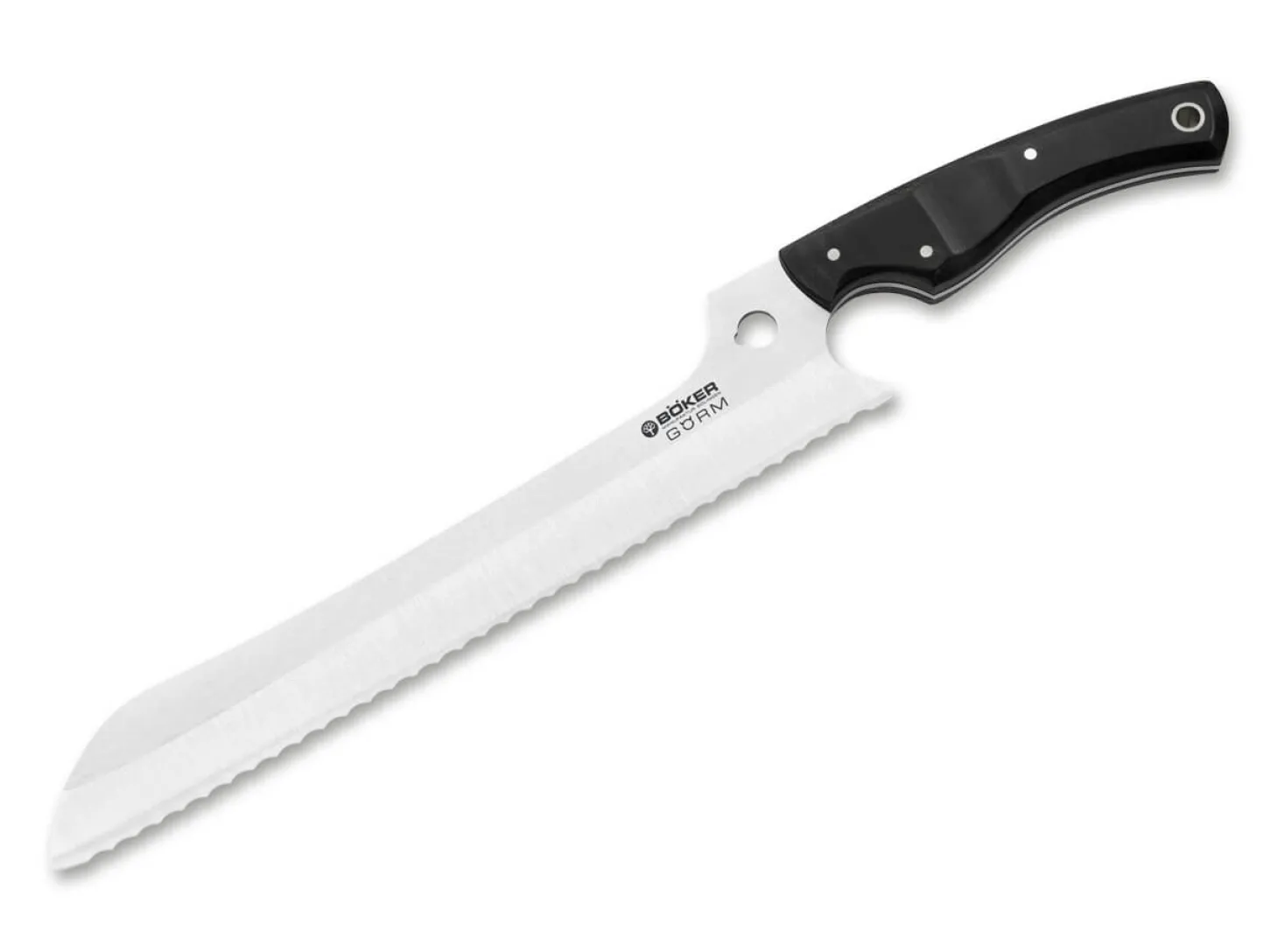 Entworfen vom renommierten Messermacher Jesper Voxnaes aus Dänemark, der Heimat der Wikinger, und handgefertigt in der Böker Messer-Manufaktur in Solingen, der Heimat hochwertiger Klingen, vereinigen die Böker Gorm Kochmesser Tugenden, die zeitlos sind und diese Serie zu einem Meisterstück der Kücheninstrumente werden lassen. Die Griffschalen der Messer bestehen aus speziell gefrästem Canvas-Micarta mit seiner natürlich anmutenden Gewebestruktur. Die Klingen werden aus 440C gefertigt, sind herkömmlichen Küchenmesserklingen haushoch überlegen und machen den Wikingern in puncto Härte alle Ehre.Das Brotmesser zeichnet sich durch den speziellen Wellenschliff aus, sowie durch die sehr lange Klinge. Neben Brot lassen sich damit natürlich auch andere harte Lebensmittel besonders gut schneiden. Im Gegensatz zum klassischen Küchenmesser werden diese beim Schneiden mit dem Brotmesser nicht zerdrückt.