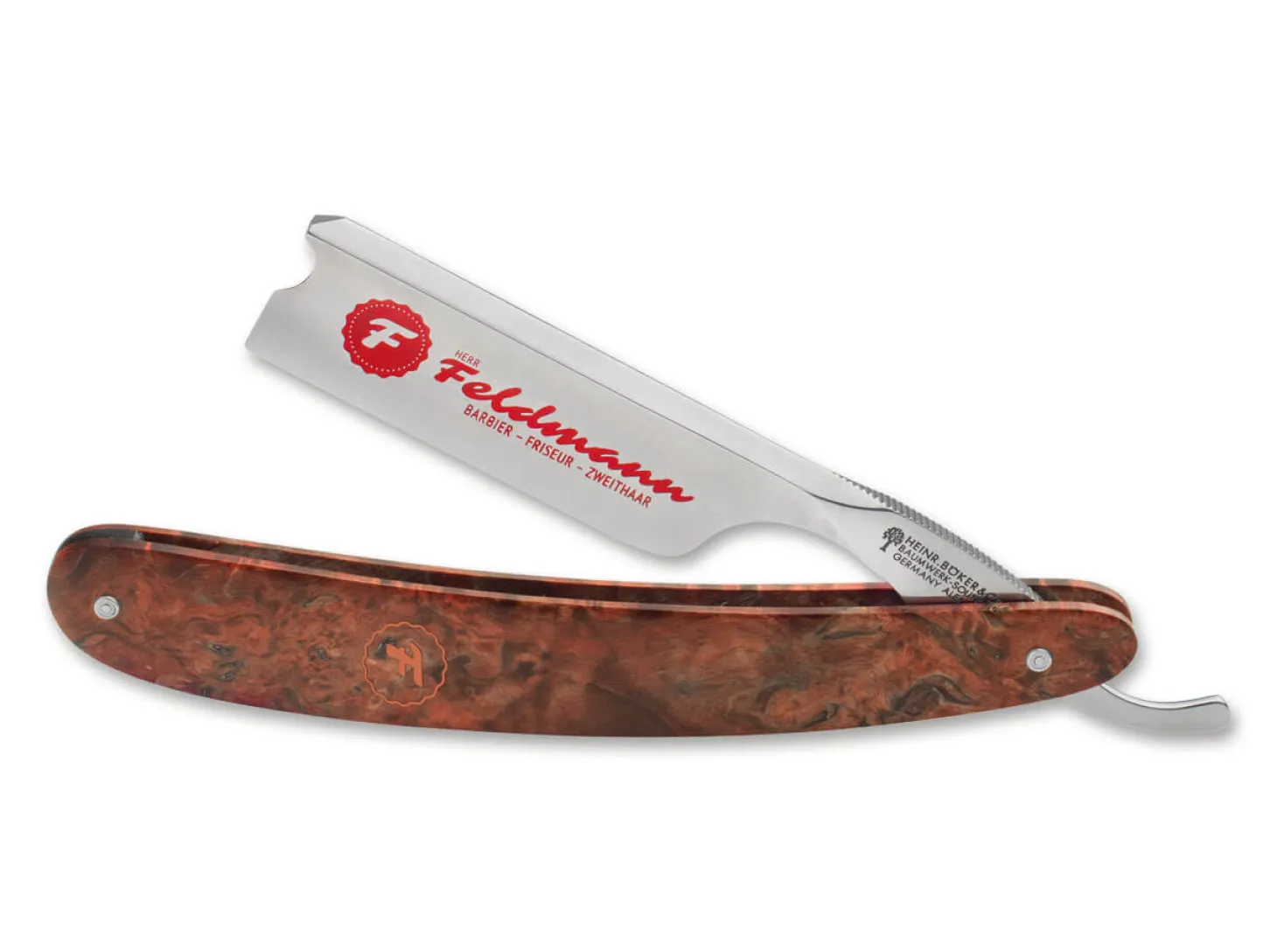 Anders als der Name es vermuten lassen könnte, hat die Pilgerstätte für Anhänger der gekonnten Bartpflege in der Marienhof-Passage in Mönchengladbach nichts mit einer Marienerscheinung zu tun. Schöpfer des weltlichen Wallfahrtsortes ist Alexander „Herr“ Feldmann, dem es mühelos gelingt, innerhalb der bunten und vielseitigen Barber-Szene noch einmal deutlich herauszustechen.Schon der schnörkellose, nüchterne Namensauftritt „Herr Feldmann | Barbier – Frisör – Zweithaar“ verrät, dass Alexander Feldmann sein Metier irgendwie anders und auch durchaus weiter fasst als seine Fachkollegen. Diese spürbare Andersartigkeit hat sich vollständig aus seinem Handwerk heraus entwickelt, denn schon seine Eltern sind beide seit jeher als Frisöre tätig. Seine Mutter betreibt bis heute einen beliebten Barbershop in New York, in dem auch er die Grundlagen seines Faches erlernen durfte. Regelmäßig besucht er sie in den Staaten, natürlich auch um sich fachlich auszutauschen. Und allmählich ist nicht mehr auf den ersten Blick klar, aus welcher Richtung Trends und Techniken über den Atlantik wechseln.Anders als die meisten Barbiere verwendet Herr Feldmann ganz selbstverständlich nur traditionell gefertigte Rasiermesser und keine Wechselklingen für eine Nassrasur. Die Haut bereitet er dafür in mehreren Schritten sorgfältig vor. Zuerst erfolgt eine Behandlung mit Rasieröl, anschließend wird eine heiße Kompresse auf das Gesicht gelegt. Danach wird eine hochwertige Rasiercreme aufgetragen, die dann mit gewärmtem Rasierschaum aus einer speziell in den USA beschafften Aufschäummaschine bedeckt wird. Die sorgfältige Rasur mit aufwendiger Vorbereitung erlebt der Kunde auf einem der beiden in den Goldene Zwanzigern in Chicago gefertigten Barber Chairs, die ihren prominentesten Dienst auf dem luxuriösen deutschen Kreuzfahrtschiff Cap Polonio geleistet haben.Diese Art der klassischen Rasur ist nur dank des konsequent umgesetztes Hygienekonzeptes möglich. Die Desinfektion aller Werkzeuge nach jedem Kunden und die schon immer von Alexander Feldmann mit seinen Mitarbeitern wöchentlich durchgeführten Hygiene-Briefings sind gerade in Zeiten von COVID-19 umso wichtiger. Herr Feldmann selbst ist eine Marke, die ihm sehr am Herzen liegt. Zum immer gleichen würdigen Auftritt gehören schwarze Hose, weißes Hemd, Hosenträger, rote Krawatte und Ärmelhalter. Und natürlich ein prächtiger und stets gepflegter Bart. Aber auch abseits der eigentlichen Bartpflege sprüht Alexander Feldmann von kreativen Ideen, wie der Barber Late Night bis zum späten Abend, einer monatlichen Barber-Flatrate und zahlreichen anderen wechselnden Events.Das in Kooperationen mit außergewöhnlichen Barbieren auch außergewöhnliche Messer entstehen, gehört bei uns inzwischen schon zum guten Ton. Die mit einem Barber’s Notch und einer beidseitigen Serrierung versehene Klinge wird extrahohl mit Wall ausgeschliffen. Neben der 6/8 Zoll breiten Klinge überzeugt das Wunschmesser von Alexander Feldmann gleich mit mindestens zwei weiteren Highlights: Die Klingenätzung wird rot ausgelegt und harmoniert hervorragend mit dem Heft aus stabilisierter und eingefärbter Maserbirke, das zusätzlich mit einer feinen Gravur versehen wurde. Mit authentischem Böker Stempel im Klingengang, Echtheitszertifikat und historischer Verpackung. Handgefertigt in der Böker Messer-Manufaktur Solingen.