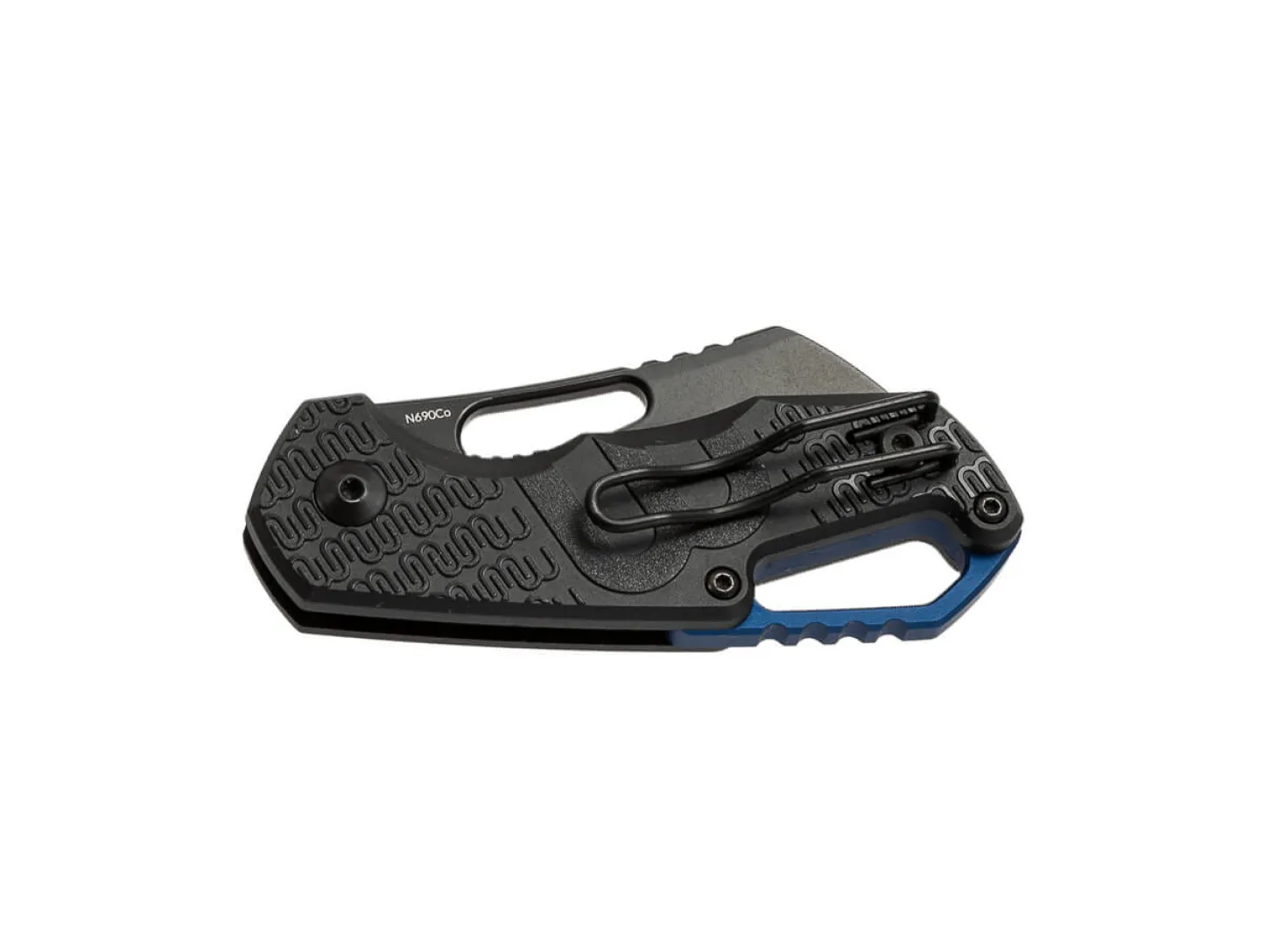 Das MKM Isonzo wurde von Jesper Voxnæs entworfen und positioniert sich klar als handliches, kompaktes Outdoormesser. Dank des blauen Spacers aus Aluminium, der als besonders großzügig dimensionierte Fangriemenöse fungiert, kann das Taschenmesser problemlos mit einem Karabiner an der Ausrüstung befestigt werden und ist so der ideale Begleiter beim Bergsteigen oder Wandern.Die kurze Cleaver-Klinge wird aus N690 gefertigt und ist mit einer widerstandsfähigen schwarzen Beschichtung versehen. Sie wird mit Hilfe der länglichen Daumenöffung geöffnet und durch einen Linerlock gesichert. Der rutschfeste Griff aus schwarzem Kunststoff verfügt über eine strukturierte Oberfläche und liegt dank den ergonomischen Griffmulden auch bei Nässe sicher in der Hand. Mit umsetzbarem Drahtclip (Tip-up/l-r).