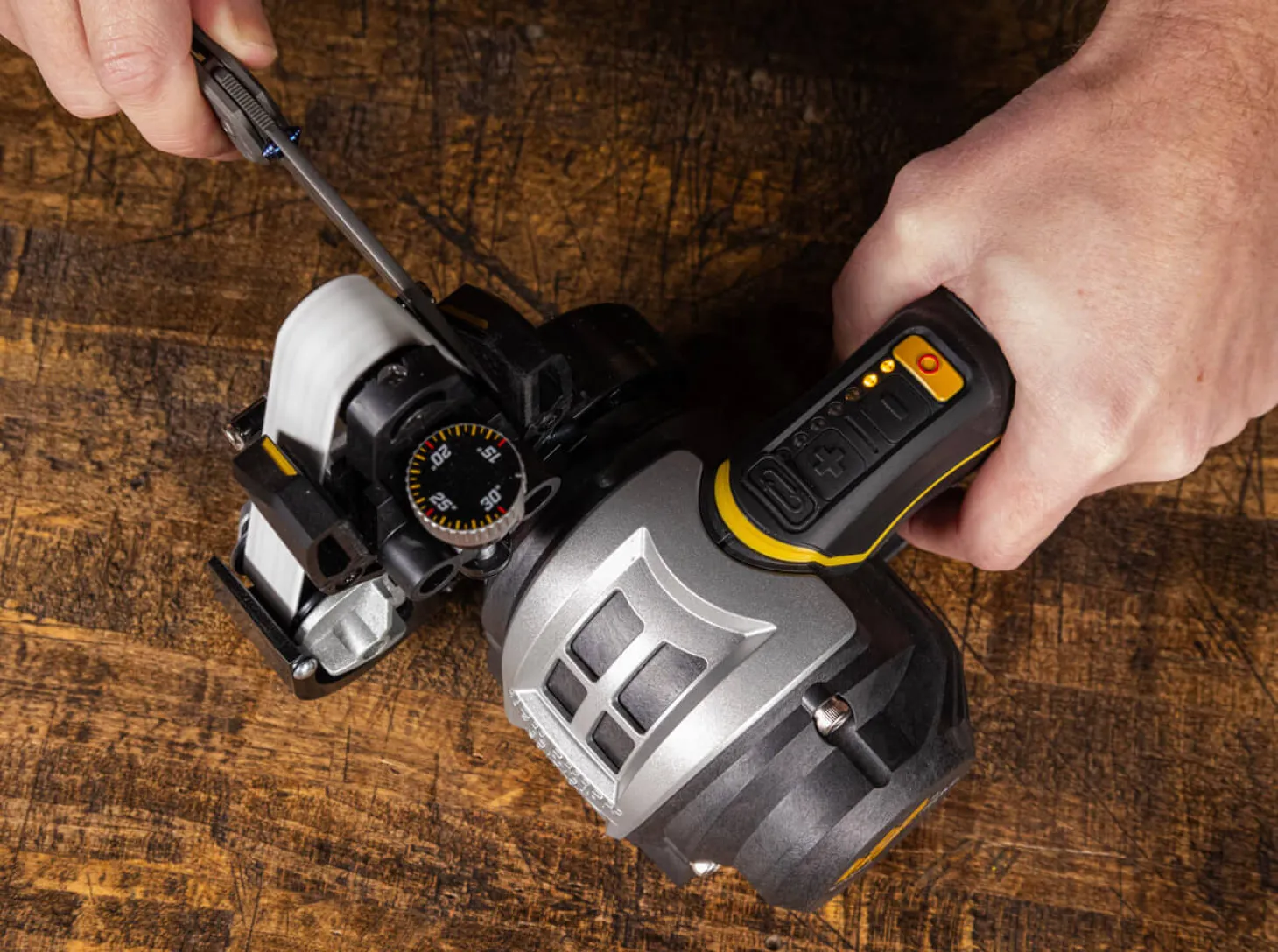 The peak of sharpness! Zusammen mit Messermacher-Legende Ken Onion hat Work Sharp den Ken Onion Edition Knife & Tool Sharpener Mk.2 als Vermächtnis und gleichsam Impulsgeber des weltweit erfolgreichen Vorgängers weiterentwickelt. Das Verdikt: optimale Schärfe bei minimalem Aufwand! Der elektronische Messerschärfer sorgt dank seiner intuitiven Bedienung für die perfekte Schärfe. Durch integrierte, flexible Schleifbänder, einer optimierten Präzisions-Schleifführung sowie einer elektronischen Drehzahlregelung mit 7 Stufen wird ein schnelles und einfaches Schärfen mit gleichbleibenden Ergebnissen zum Kinderspiel. Die verbesserte Winkelführung des Messerschleifers bietet für jeden beliebigen Schneidwinkel zwischen 15° und 30° eine Feineinstellung in 0,5° Schritten, während die Fütterung aus weichem Leder ein Verkratzen der Klinge effektiv verhindert. Wenn es auf präzise Schärfergebnisse ankommt, liefert die elektronische Geschwindigkeitsregelung mit LED-Anzeige ein sattes Drehmoment bei niedriger Drehzahl, während die Hochgeschwindigkeitseinstellung die nötige Leistung für schwere Schärf- und Schleifarbeiten an einer Vielzahl von Messern und Werkzeugen bietet. Mit der flexiblen Schärfbandtechnologie wandert nun Profi Know-How von Messermachern und -herstellern an die heimische Werkbank. Die mitgelieferten 3/4″ x 12″ Norton Schleifbänder unterschiedlicher Körnung (je 1x P120 Extra Coarse, X65 Coarse, X22 Medium, X4 Fine und 6000 Extra-Fine) bieten von der Reparatur beschädigter Klingen bis hin zur Erstellung einer scharfen, hochpolierten Schneide ein breites Einsatzspekturm und stehen für Langlebigkeit sowie Präzision. Das elektronische Schärfgerät ist ideal zum Schärfen von Taschenmessern, feststehenden Messern, Kochmessern, Scheren, Äxten, Werkzeugen oder Klingen mit Wellenschliff. Als weltweit führender Hersteller von Messerschärfern steht Work Sharp für Qualität, Innovation und intuitive Bedienkonzepte. Entwickelt, kalibriert und qualitätsgeprüft in Ashland, Oregon in den USA. Betriebsbereit, 220V Netzanschluss.