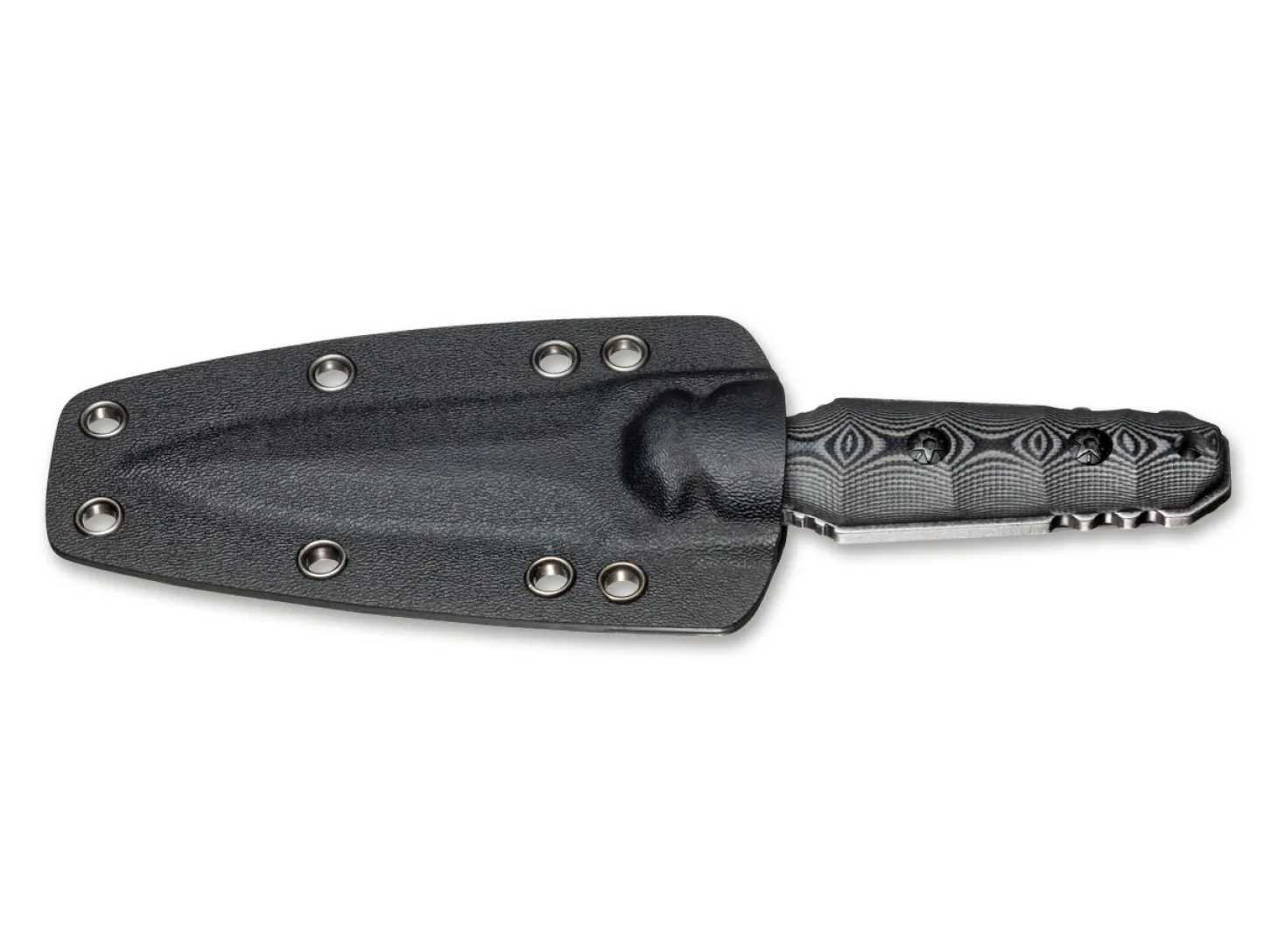 Das feststehende Magnum Lil‘ Grave Digger ist ein klassischer Stiefeldolch mit flacher Kydexscheide und Gürteladapter. Der Dolch ist nicht das typische Werkzeug für Schneidaufgaben, kann aber als Zusatzmesser z.B. beim Vergraben organischer Abfälle auf Trekking- Touren und anderen artfremden Anwendungen gute Dienste leisten. Das Acidwash-Finish der 440A-Klinge in robuster Fulltang-Konstruktion harmoniert hervorragend mit den Griffschalen aus grauschwarz geschichtetem Micarta. Der überstehende Erl ist mit Riffelungen zur erhöhten Griffsicherheit versehen.