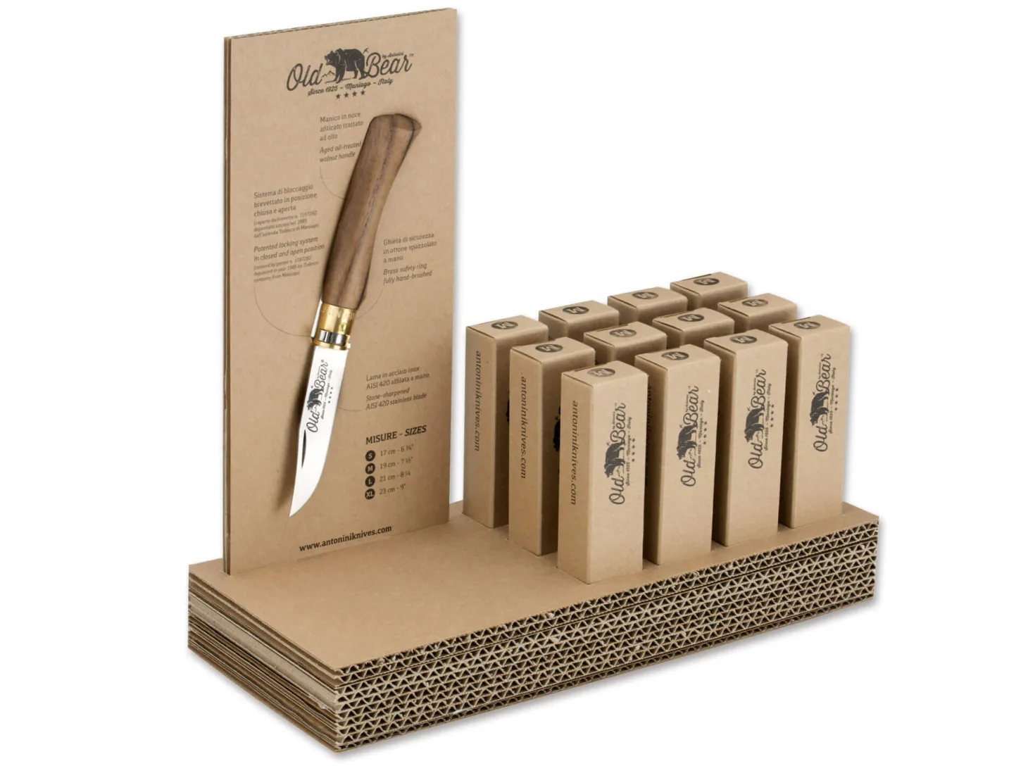 Zum 90. Geburtstag präsentierte die 1925 gegründete Firma Antonini die Serie Old Bear, die das klassische Taschenmesser auf sehr überzeugende Weise interpretiert. Kernstück der Messer sind die aus Holz gefertigten Griffe, die den traditionellen Verriegelungsmechanismus tragen. Ein in die Messingzwinge eingesetzter Drehring, der die Klinge sowohl offen wie auch geschlossen arretiert, wurde bereits 1985 von der Firma Todesco in Maniago, dem aktiven Partner bei diesem Projekt, als Verriegelung für Taschenmesser patentiert.Die einfache Handhabung und die überaus klassische Anmutung dieser traditionellen Taschenmesser mit Walnussholz-Beschalung machen das Old Bear nicht zuletzt im Zusammenspiel mit dem günstigen Einstandspreis zu einem mehr als attraktiven Angebot. Rostfreie Klinge aus 420-Edelstahl, von Hand abgezogen. Hergestellt in Italien.Das Set besteht aus 12 Old Bear M Messern und einem kostenlosem Old Bear M Messer zur Präsentation.