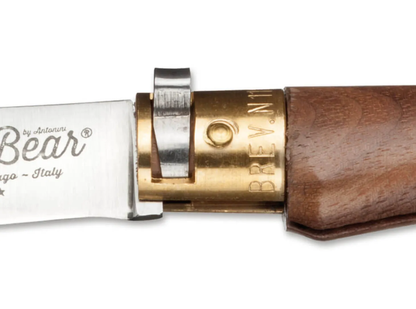 Zum 90. Geburtstag präsentierte die 1925 gegründete Firma Antonini die Serie Old Bear, die das klassische Taschenmesser auf sehr überzeugende Weise interpretiert. Kernstück der Messer sind die aus Holz gefertigten Griffe, die den traditionellen Verriegelungsmechanismus tragen. Ein in die Messingzwinge eingesetzter Drehring, der die Klinge sowohl offen wie auch geschlossen arretiert, wurde bereits 1985 von der Firma Todesco in Maniago, dem aktiven Partner bei diesem Projekt, als Verriegelung für Taschenmesser patentiert.Die einfache Handhabung und die überaus klassische Anmutung dieser traditionellen Taschenmesser mit Walnussholz-Beschalung machen das Old Bear nicht zuletzt im Zusammenspiel mit dem günstigen Einstandspreis zu einem mehr als attraktiven Angebot. Rostfreie Klinge aus 420-Edelstahl, von Hand abgezogen. Hergestellt in Italien.