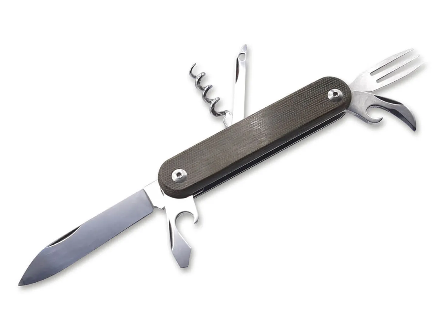 Das Multifunktionsmesser Malga 6 von MKM überzeugt mit seiner Vielseitigkeit. Neben der Messerklinge aus M390 verfügt es über einen Korkenzieher, einen Flaschenöffner, einen Dosenöffner, einen Schlitzschraubendreher und eine Gabel. Der Griff aus grünem Micarta unterstreicht die absolute Praxistauglichkeit des Taschenmessers. Ohne Clip.