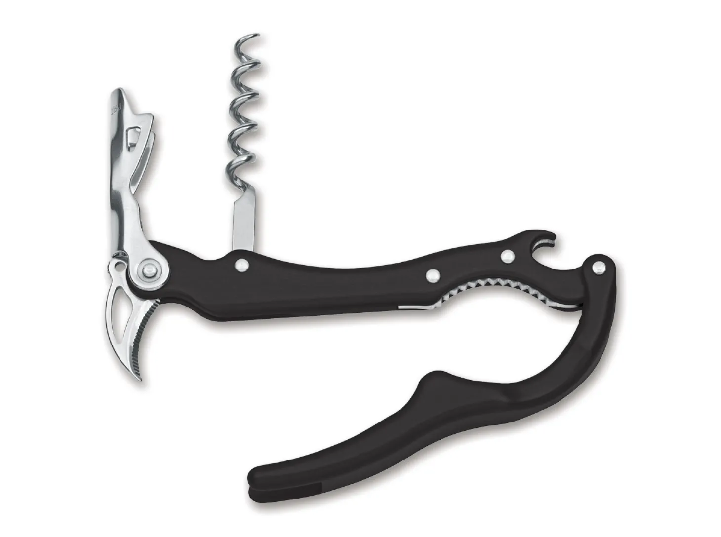 Der MC01 Sommelier-Korkenzieher von Due Cigni ist mit einem ausklappbarem Hebel, einer ausklappbarern Folienklinge, einem Flaschenöffner und einem Greifer für festsitzende Drehverschlüsse ausgestattet. Gefertigt aus Aluminium und Edelstahl.