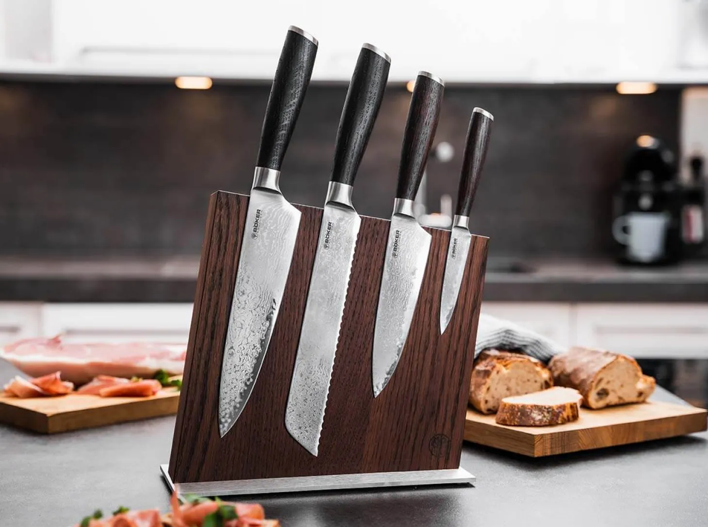 Der Böker Messerblock Style aus Räuchereiche ist mit vier Messern der Serie Böker Meisterklinge Damast bestückt: Spickmesser, kleines Kochmesser, Brotmesser und Kochmesser und überzeugt durch den hochwertigen Materialmix aus naturbelassenem Massivholz und gebürstetem Edelstahl. Preisvorteil gegenüber Einzelbestellung 10%.