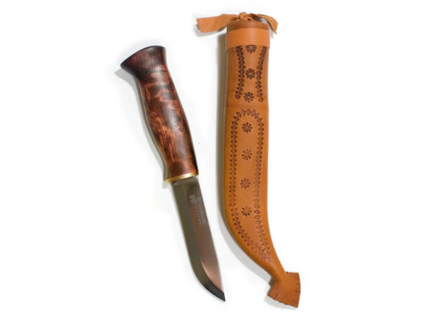 Messergriff aus geölter Maserbirke, Klinge 21 x 100 mm aus Karbonstahl 1770, gehärtet auf 57HRC. Messerscheide aus Rinderleder mit Kunststoffeinlage.