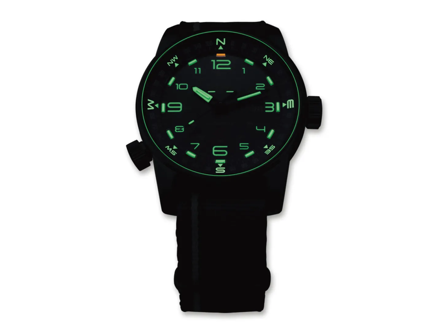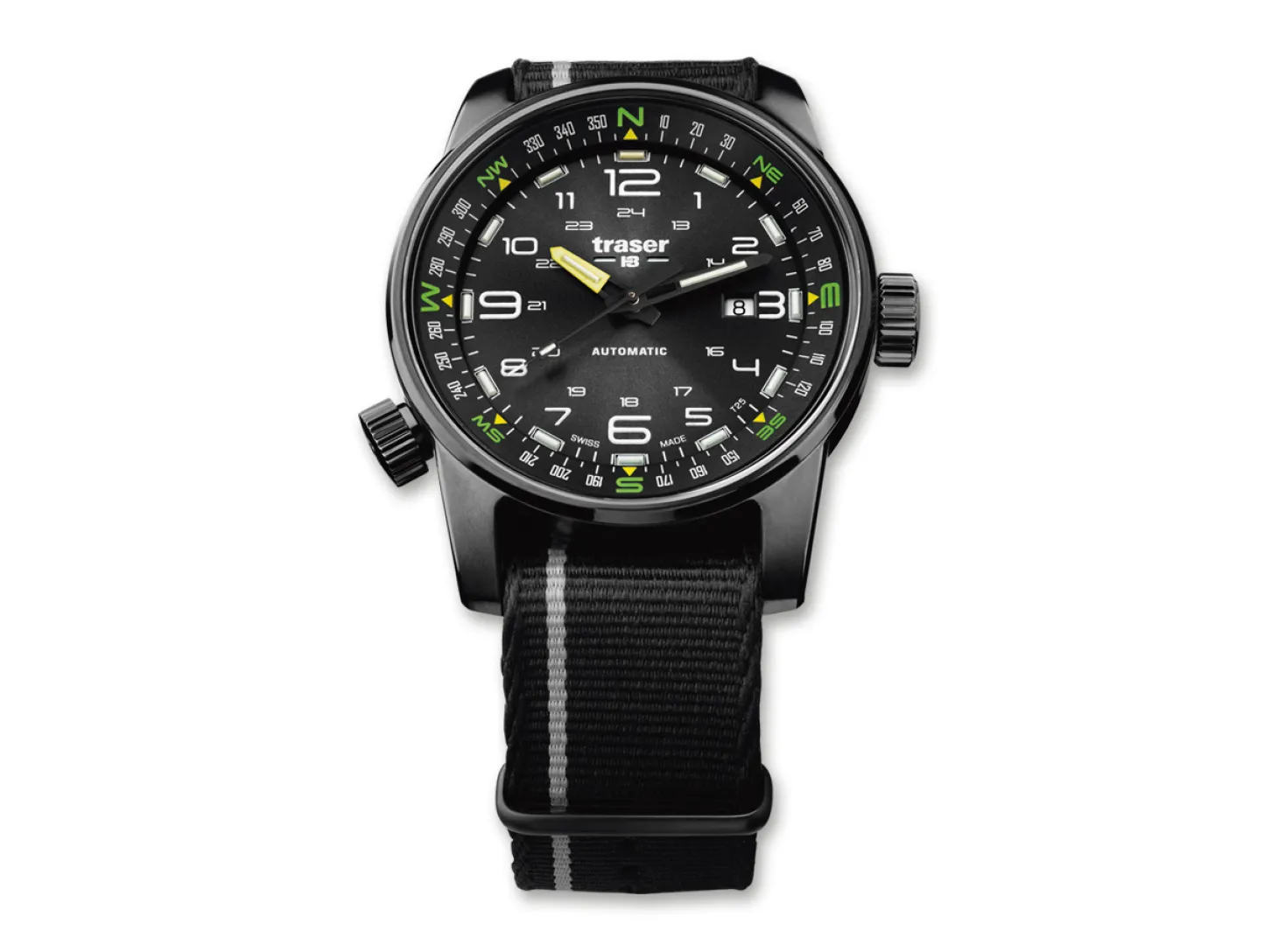 Ob im Großstadt-Dschungel, in kargen Wüstengebieten oder unterwegs auf den Weltmeeren: Die Traser P68 Pathfinder Automatic zeigt nicht nur die Zeit an, sondern auch den Weg auf. Der integrierte Kompassring macht aus dieser Uhr einen echten Pfadfinder, der seinen Träger die geographische Richtung bestimmen und dem eigenen Abenteuergeist folgen lässt. Damit die P68 für Abenteurer und Entdecker ein zuverlässiger Begleiter bleibt, garantiert die trigalight Selbstleuchttechnologie die einwandfreie Ablesbarkeit der Zeit, überall und jederzeit.Die P68 hat einen Durchmesser von 46 Millimetern und beherbergt ein Original Swiss Made Automatik Uhrwerk. Das Glas aus anti-reflektierendem Saphir besticht in Kombination mit dem Uhrengehäuse aus PVD-beschichtetem Edelstahl und verdeutlicht den hochwertigen Eindruck. Die weißen Ziffern und verschiedenfarbigen Uhrzeiger sitzen auf einem schwarzen Ziffernblatt. Die Himmelsrichtungen sind in Grün gehalten und harmonisieren so mit dem mehrfarbigen NATO-Armband. Die trigalight Selbstleuchttechnologie erleuchtet Index 1 bis 11 in grüner Farbe und Index 12 in orangener Farbe.