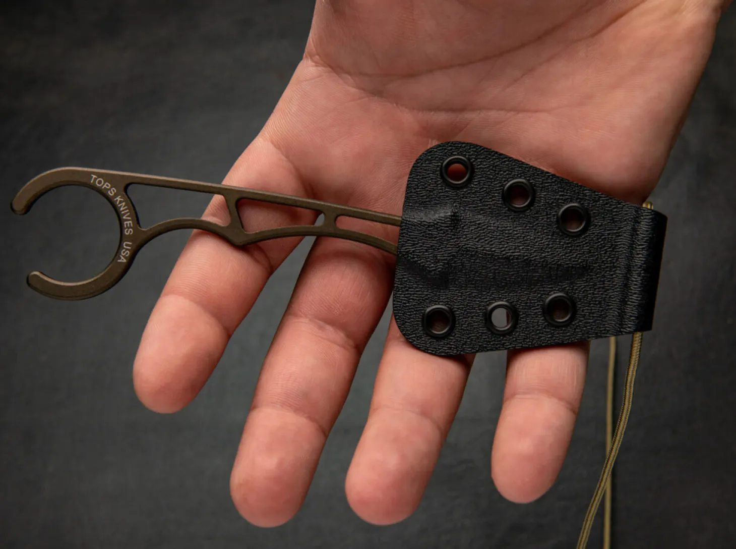 Das TOPS Papa Delta wurde von Leo Espinoza in Zusammenarbeit mit einem pensionierten Polizei- und Geheimdienstmitarbeiter entwickelt. Als taktisches Neck Knife kommt es vor allem auf eine diskrete Trageweise an. Aus diesem Grund ist es dünn, skelettiert und in jeder Hinsicht unauffällig. Das „unvollständige“ Fingerloch ist absichtlich nicht verschlossen, damit das Messer leichter losgelassen werden kann als bei einem normalen Karambit mit geschlossenem Ring. Die beidseitig abgezogene Klinge aus 1095 ist von einem Bronze Cerakote-Finish überzogen und verleiht dem feststehenden Messer eine besondere Anmutung. Dank der mitgelieferten Kydex Scheide lässt sich das Papa Delta ideal um den Hals tragen.