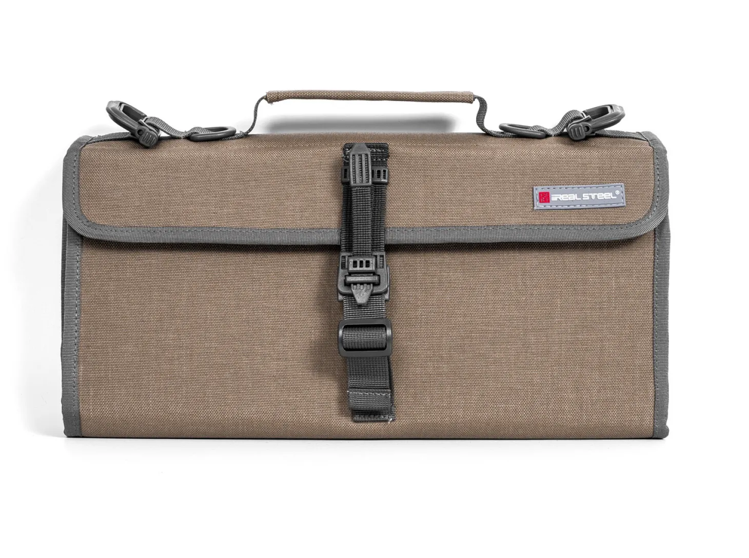 Sammel- und Aufbewahrungstasche für bis zu 22 Taschenmesser. Die Messer befinden sich in rückwärtig gepolsterten Einzelfächern, und durch die transparente Vorderseite der einzelnen Fächer ist der Inhalt der Tasche auf Anhieb erkennbar. Die in die Tasche eingearbeitete Aluminiumverstärkung sorgt für Formstabilität. Mit Schultertrageriemen und Zusatzhaken für kleinere Ausrüstungsgegenstände.