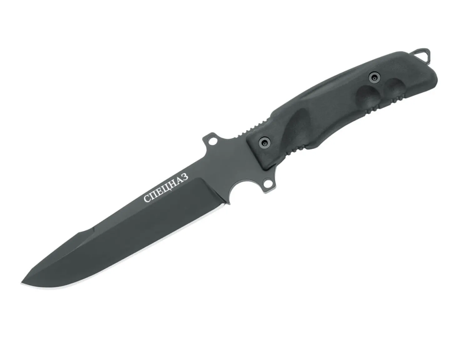 Das Predator Spetsnaz geht auf ein Messer russischer Spezialeinheiten zurück, wurde aber behutsam in den FKMD-typischen Stil transponiert. Der charakteristische Forprene-Griff liegt bei allen Temperaturen angenehm in der Hand. Die zusätzlichen Riffelungen im Erl sowie die versetzten Parierelemente tragen zum sicheren Handling bei. Über die Bohrungen kann das Messer auch an einen Stock gebunden und als Speer/Harpune benutzt werden. Mit Fangriemenöse. Version mit glatter Schneide.