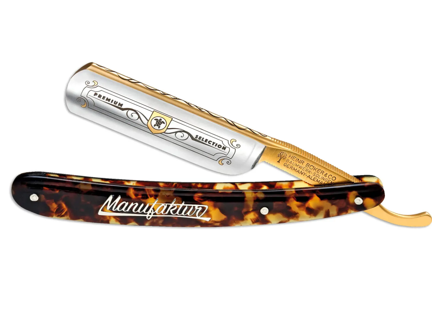 Die Rasiermesser der Böker Premium-Selection setzen sich noch einmal von den Highlights in diesem Katalog ab. Die sehr aufwändig verarbeiteten Hefte werden in der Böker Manufaktur Solingen aus dem vollen Material ballig gefräst und sehen den klassischen Naturmaterialen zum Verwechseln ähnlich. Die Intarsien aus Neusilber unterstreichen die aufwendige Fertigung und Veredelung der Hefte und Klingen in Handarbeit.Deutlich aufgewertet wurde auch der Vorgänger dieses beliebten Böker Schildpatt-Modells in 6/8 Zoll. Neues Klingendesign, partielle Vergoldung, verzierter Klingenrücken, Intarsie aus Neusilber und die beidseitige Serrierung sind nur als einige Neuheiten zu nennen. Zudem verleiht die dritte Niete dem Messer zusätzlich Stabilität. Die extrahohl und mit Wall geschliffene Klinge wird aus klassischem nicht rostfreien Kohlenstoffstahl gefertigt. Inklusive Echtheitszertifkat und historischer Verpackung.