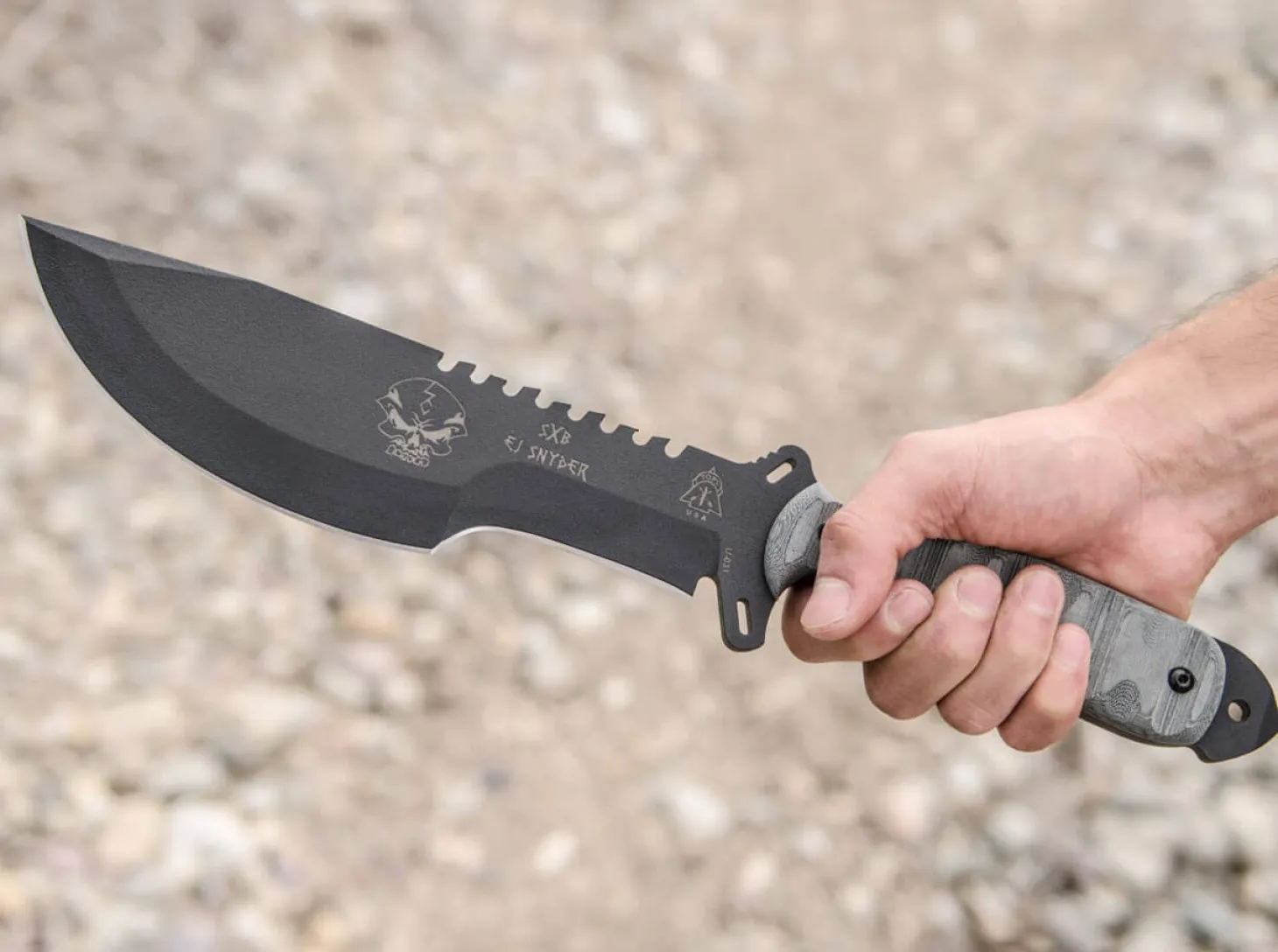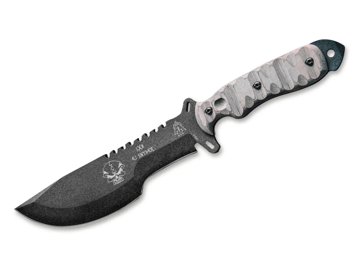Das TOPS SXB ist ein zuverlässiges Überlebensmesser, das sowohl für die Wildnis als auch für den militärischen Einsatz konzipiert wurde. Entworfen wurde das eindrucksvolle Outdoormesser von EJ Snyder, einem hochdekorierten Armeeveteran, Überlebenskünstler und Abenteurer. Das robuste, langlebige Skullcrusher’s Xtreme Blade ist mit einer beschichteten Klinge aus 1095 Kohlenstoffstahl ausgestattet. Die strukturierten Griffschalen bestehen aus Micarta und liegen dank ihrer ergonomischen Form stets sicher in der Hand. Mit hochwertiger Nylonscheide.