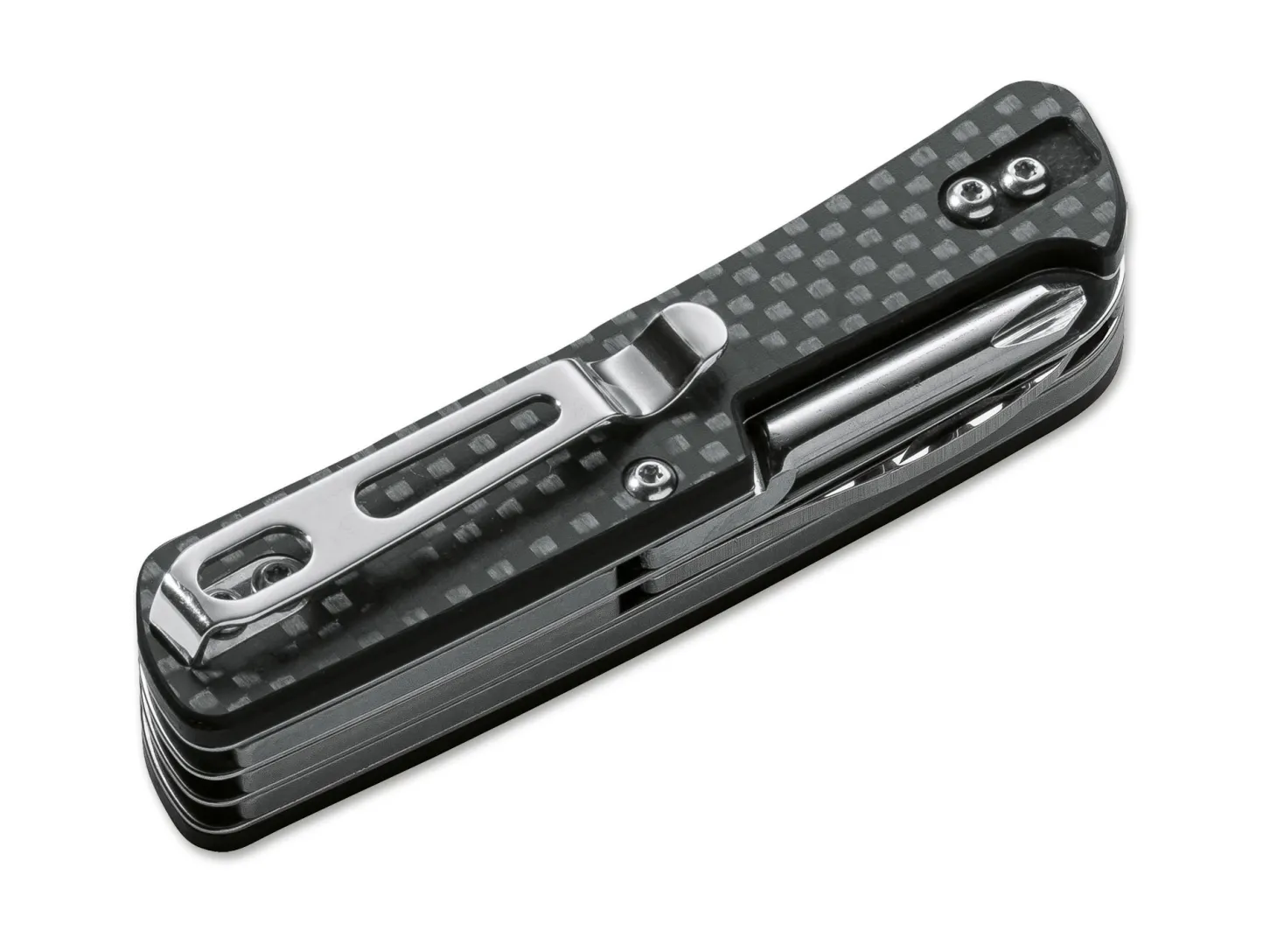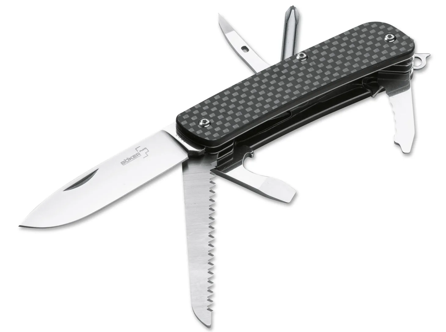 Der große Erfolg unserer Böker Plus Tech Tools zeigt sich unter anderem in den vielen Wünschen nach weiteren Varianten, die von unseren Kunden an uns herangetragen werden. Die Kombination aus unserem Know-how, der Verwendung von hochwertigen Materialien wie Sandvik 12C27 als Klingenstahl (Härte 58-60 HRC), Edelstahlplatinen und der verschraubten Konstruktion heben unsere Böker Plus Tech Tools ebenso vom herkömmlichen Taschenmesser ab wie der integrierte Glasbrecher und die ausklappbare Fangriemenöse, über die die meisten Modelle verfügen. Die Carbon Fiber Edition besitzt eine exklusive Beschalung aus einem laminierten Material-Mix aus unverwüstlichem G10 als Basis, mit einer Oberfläche aus polierter Kohlefaser, das im Zusammenspiel mit den polierten Klingen eine besonders edle Anmutung erzeugt. So bietet die Edelversion nicht nur uneingeschränkte Vielseitigkeit und edle Materialien, sondern lässt auch die Sammlerherzen höherschlagen.Ausgerüstet mit einer großen Klinge (12C27) und folgenden Werkzeugen (4Cr13): Glasbrecher, Großer Schraubendreher mit Flaschenöffner und Drahtbieger/-abisolierer, Kleine Wellenschliffklinge mit Schraubendreherspitze und ausklappbare Fangriemenöse, Kreuzschlitzschraubendreher, Näh-/Bohrahle, Holzsäge, Clip.