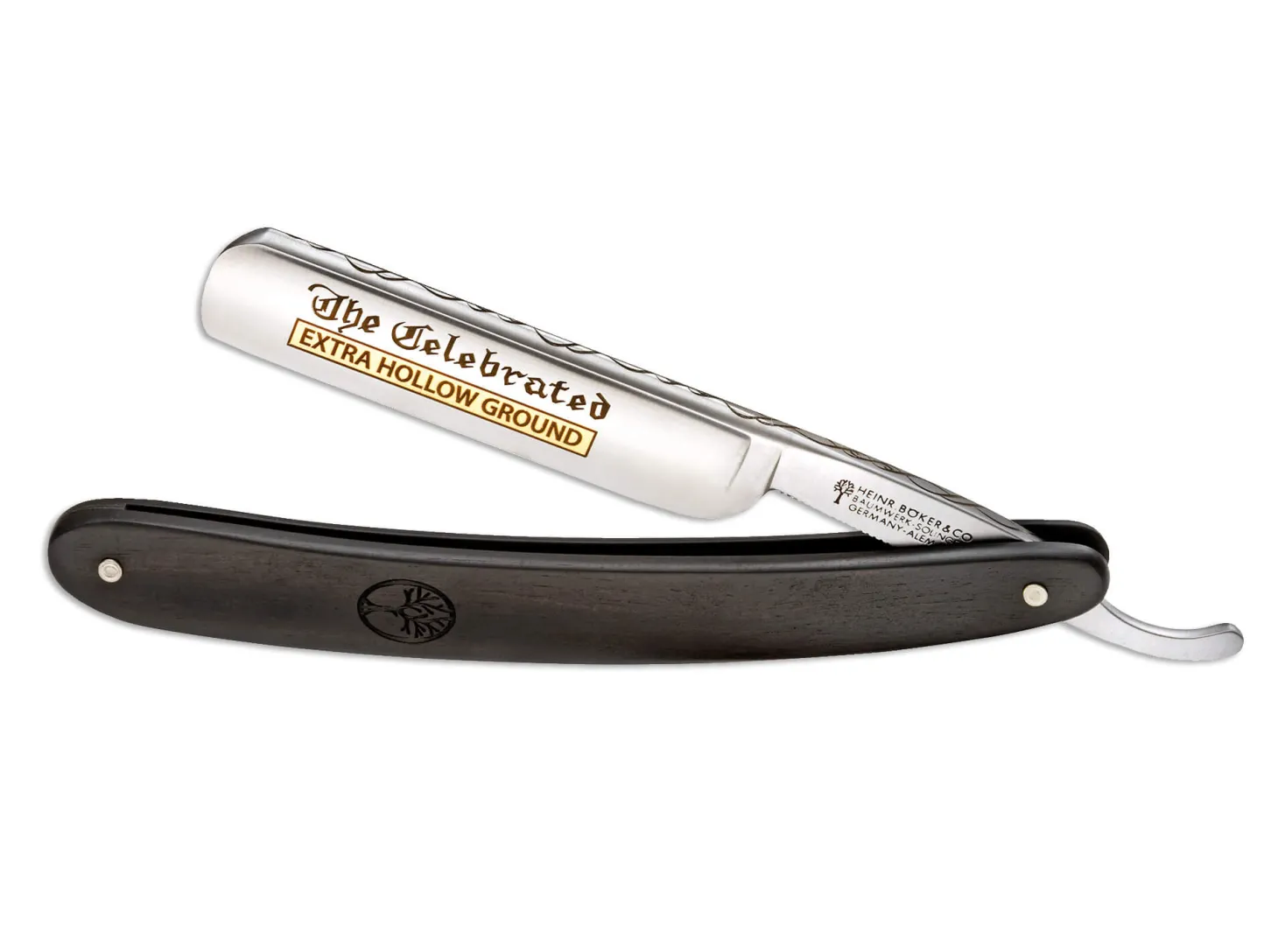 Wiederauflage der berühmtesten Modelle in der langen Geschichte der Böker Rasiermesser. Bereits im Produktkatalog von Boker USA aus dem Jahr 1906 wurden besonders hochwertige Modelle mit diesem traditionsreichen Schriftzug ausgezeichnet. Auch bei den neu konzipierten Modellen mit Heften aus Edelhölzern werden die beliebten 5/8 Zoll breiten Klingen aus Kohlenstoffstahl aufwendig gefertigt und verziert. Die Klinge wird extrahohl mit Wall geschliffen. Inklusive Echtheitszertifikat und historischer Verpackung.Die Griffschalen bestehen aus edel schimmerndem zertifizeirt importiertem Ebenholz, welches sich durch seine Robustheit, die hohe Dichte und Alterungsbeständigkeit auch aus funktionalen Gründen absolut anbietet. Veredelt ist dieses Modell mit einer partiellen Vergoldung und dem klassischen Böker-Baumsymbol, welches filigran in das zertifiziert Importierte Edelholzheft eingearbeitet wird.
