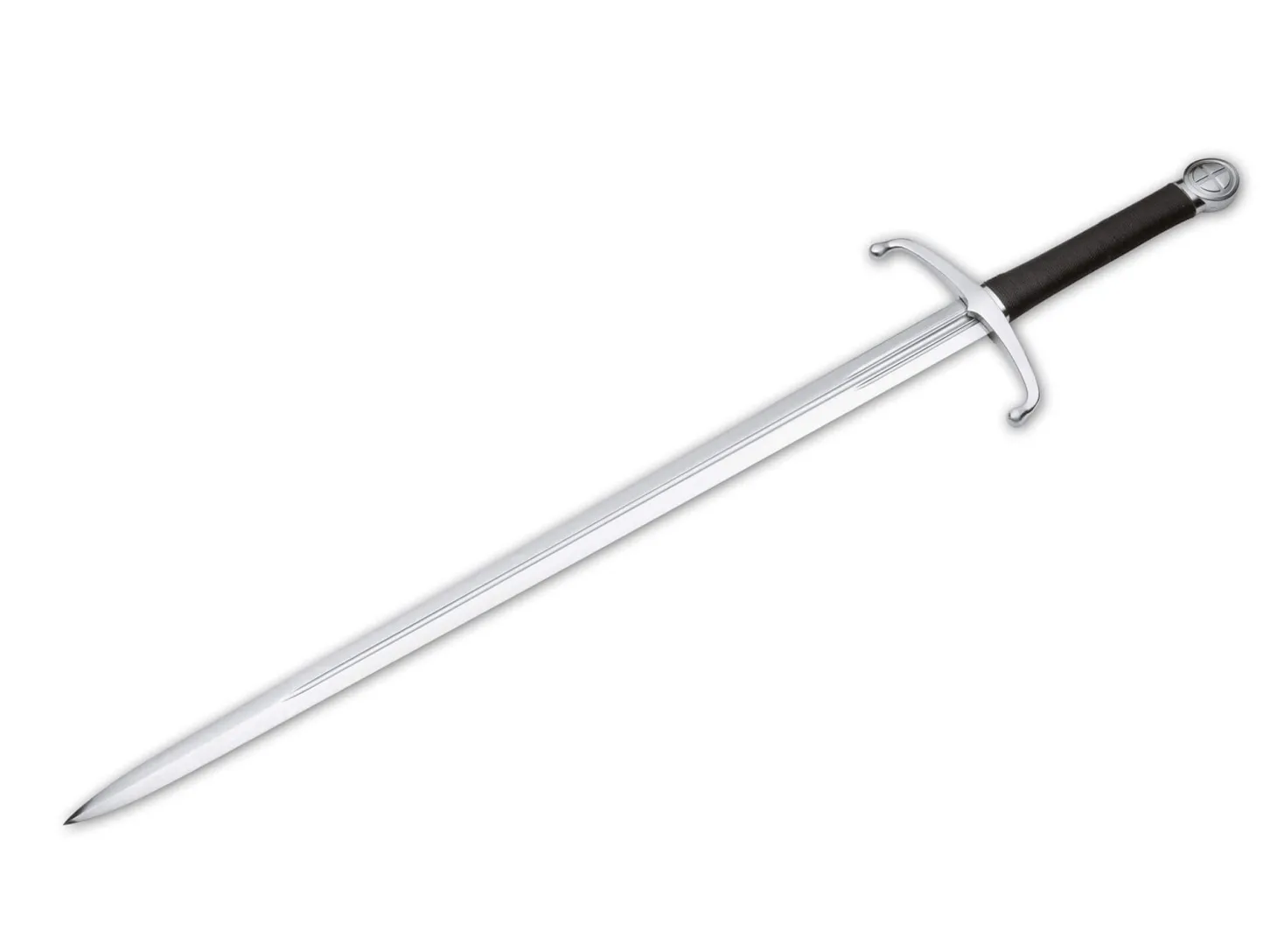 Nach zahlreichen Anfragen nach Blankwaffen aus anderen Epochen und Ländern präsentieren wir dieses typisch mittelalterliche Schwert. Die Klinge ist fein satiniert und geschliffen, gefertigt aus bestem 1045 Kohlenstoffstahl und verfügt über drei Hohlkehlen. Der Abschlussknauf am Griff dient der besseren Balance, und die feine Kordelwicklung liegt sehr angenehm und sicher in der Hand. Der ausladende Handschutz ist aus Edelstahl gefertigt. Inkl. einer ansprechenden Lederscheide mit Metallapplikationen.Deko- bzw. Sammlerschwert, nicht zum Einsatz geeignet.Dieser Artikel wird als Sperrgut verschickt.