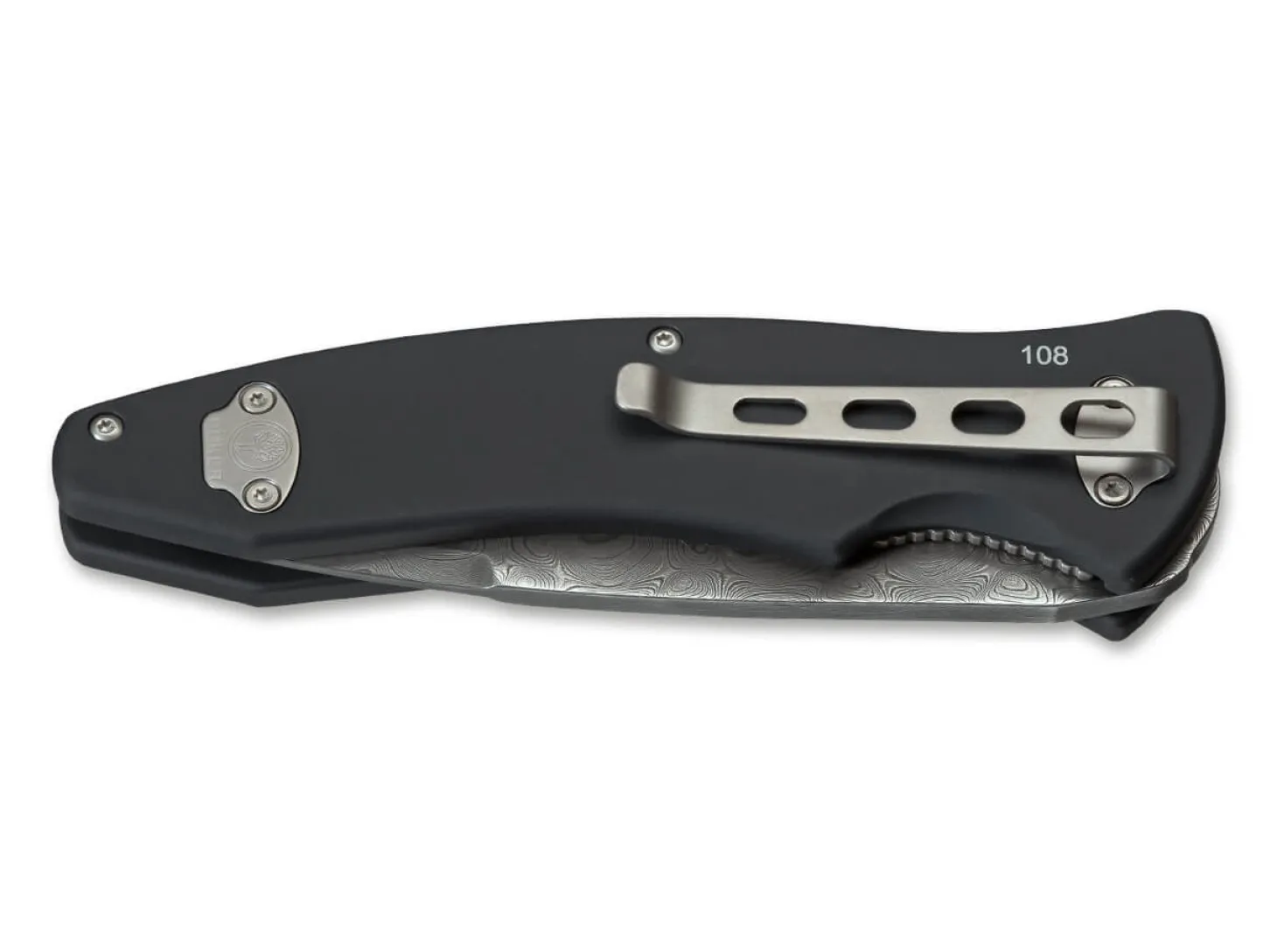 Ein Stück Geschichte wird lebendig: Die Tirpitz, Schwesterschiff der legendären Bismarck, war das größte Schlachtschiff, das jemals für die deutsche Marine vom Stapel lief. Nach Indienststellung im Februar 1941 wurde die Tirpitz während des Zweiten Weltkriegs schnell zum Schrecken der Alliierten Marineverbände im Nordatlantik. Legendär sind die zahlreichen Versuche, diesen waffenstarrenden Koloss außer Gefecht zu setzen. Nachdem die Tirpitz bereits im September 1944 durch schwere Fliegerangriffe der Royal Air Force stark beschädigt wurde, beschloss man, das Schiff als stationäre Batterie bei Tromsö vor der norwegischen Küste einzusetzen. Auch hier wurden wiederholt schwere Angriffe auf die Tirpitz geflogen, und am 12. November 1944 gelang es der Royal Air Force, durch den Einsatz spezieller „Tallboy-Bomben“ die Tirpitz im seichten Wasser zum Kentern zu bringen.Direkt nach Ende des Krieges begann ein norwegisches Spezialunternehmen, das Schiff auszuschlachten, um den hoch legierten Stahl zivilen Zwecken zur Verfügung zu stellen. Die Wissenschaft war sehr interessiert am Tirpitz-Stahl, der in der Forschung und Entwicklung für Messtechnik und sogar der Raumfahrt zum Einsatz kam. Norwegische Taucher haben für Böker aus dem Fjord Teile der speziellen Panzerung der Tirpitz geborgen. Aus diesen Stücken lebendiger Geschichte schmiedet der Böker-Damastschmied exklusiv einen außergewöhnlichen Damast mit faszinierender Historie. Das Muster Große Pyramide in 300 Lagen zeichnet die mächtige Klinge aus handgeschmiedetem Damast-Stahl und macht das Messer zu einem Höhepunkt jeder Messersammlung. Die Kombination des Tirpitz-Stahls mit Kohlenstoff-Werkzeugstählen ergibt aber auch einen extrem beanspruchbaren Damast-Stahl, der mit einer Rockwellhärte von 61 bis 63 HRC im Alltagseinsatz jeder Aufgabe gewachsen ist. Die Verriegelung erfolgt durch einen 1,5 Millimeter starken Linerlock.Der Griff aus hochfestem Aluminium AlMgSi1 (durch den Silizium-Anteil deutlich hochwertiger als das gewöhnliche AlMg3) ist hardcoat-anodisiert und lässt das Messer sicher und satt in der Hand liegen. Der umsetzbare Clip (Tip-up/Tip-down) ermöglicht das Tragen in der gewünschten Position. Als Material für die Griffeinlage haben wir heimisches Walnussholz gewählt, das aufgrund seiner überragenden Eigenschaften schon als Verwendung von Schaftholz bei Langwaffen eine lange Tradition hat. Inklusive original Tirpitz Wappen. Dieses Messer vereint auf einzigartige Weise Geschichte, Tradition und moderne Technik, vollständig von Hand gefertigt in der Böker Manufaktur in Solingen. Die Lieferung erfolgt in einer hochwertigen transparenten Rahmenschatulle mit Zertifikat und Seriennummer.