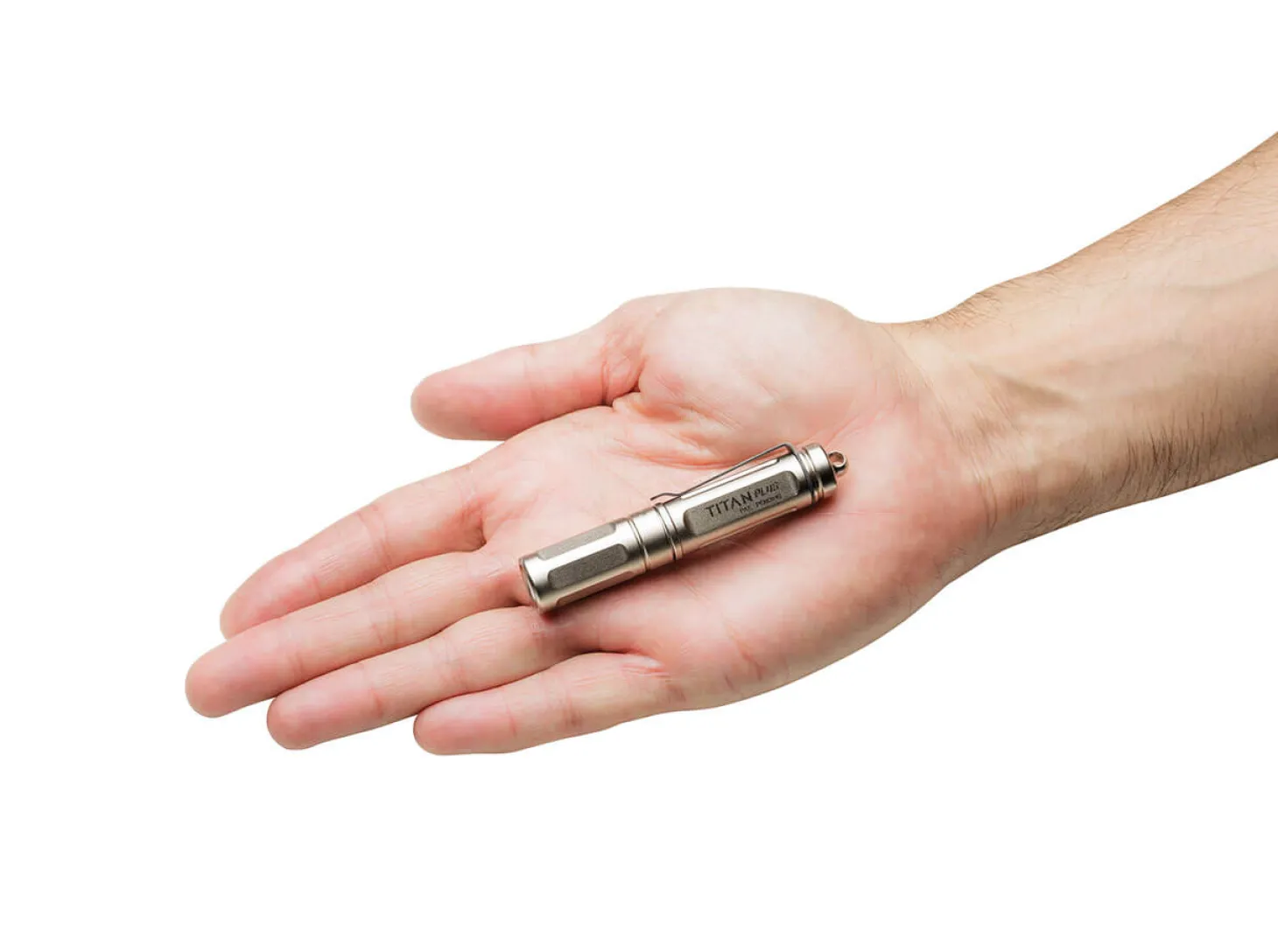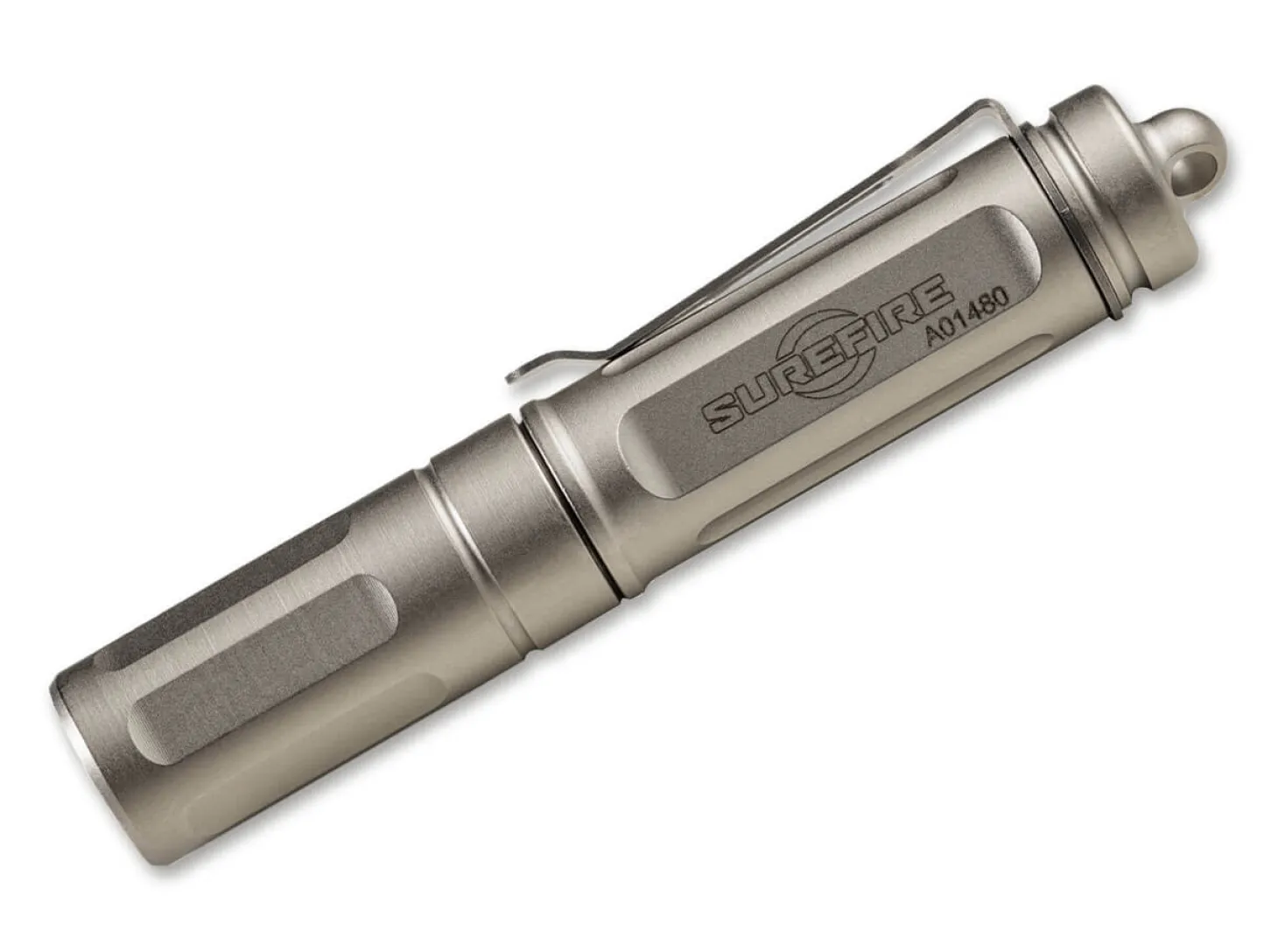 Die überarbeitete, überaus kompakte SureFire Titan Plus überzeugt als handliche Taschenlampe für den Schlüsselbund mit drei verschiedenen Leuchtstufen (300/75/15 Lumen) und einer maximalen Reichweite von ca. 66 Metern. Der von SureFire entwickelte MaxVision Beam Reflektor erzeugt einen gleichmäßigen, optimierten Lichtstrahl für den Nah- und Mittelbereich. Zum Aktiveren der einzelnen Funktionen wird der Lampenkopf gegen den Uhrzeigersinn gedreht. Die SureFire Titan wird mit einem wiederaufladbaren AAA NiMH Akku ausgeliefert und kann bei Maximalleistung ca. 60 Minuten lang betrieben werden. Alternativ kann auch eine handelsübliche AAA Batterie genutzt werden. Das robuste Gehäuse aus vernickeltem Messing ist wasserdicht nach IPX7. Mit demontierbarem Clip.