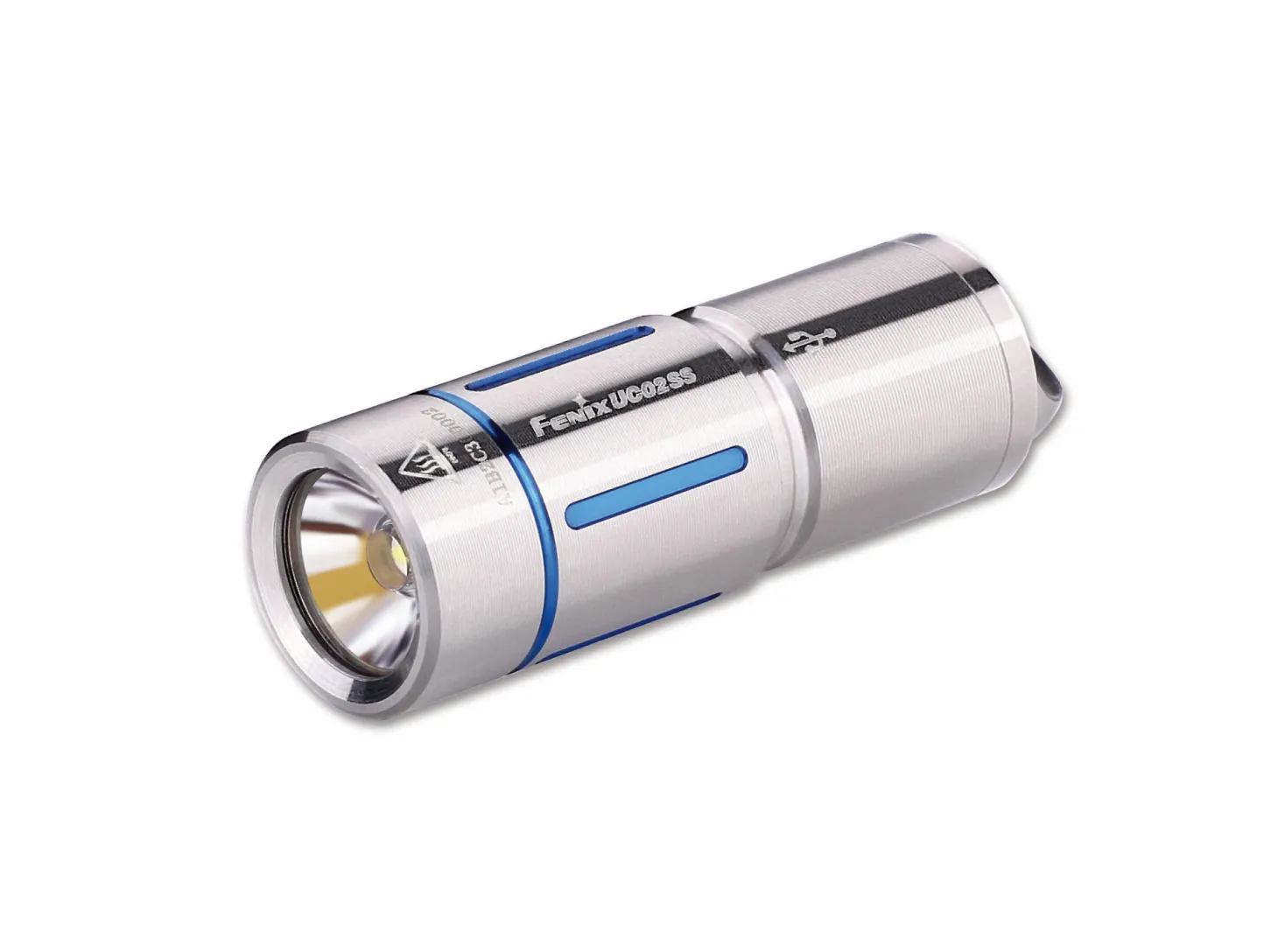 Mit gerade einmal 4,3 cm Gesamtlänge und 1,4 cm Durchmesser ist die UC02 als per USB aufladbare Schlüsselbundlampe unglaublich kompakt und vielseitig. Der im Lieferumfang enthaltene Akku Typ 10180 lässt sich über den per Schraubkappe gesicherten USB-Port in nur 45 Minuten aufladen. Ladestatusanzeige. 2 Lichtstufen (130/10 Lumen) per Drehschalter aktivierbar. Lieferung mit Akku, Schlüsselring und Ersatzdichtung. Wasser-/staubdicht n. IP68 (Edelstahl) und IPX8 (Alu). Edelstahl mit blauen Akzenten, inklusive Trageschnur.