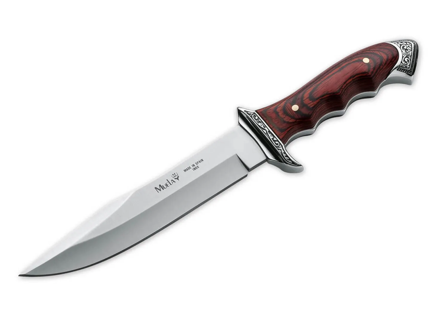 Das Muela Venecia ist ein kunstvoll verziertes Jagdmesser mit klassischer Anmutung. Der Knauf und das Parierelement sind vernickelt und mit feinen dekorativen Ornamenten versehen. Die Klinge wird aus rostfreiem I-42 Chromstahl gefertigt. Als Griffmaterial kommt dunkles Pakkaholz zum Einsatz. Lieferung mit praktischer Kunstlederscheide.