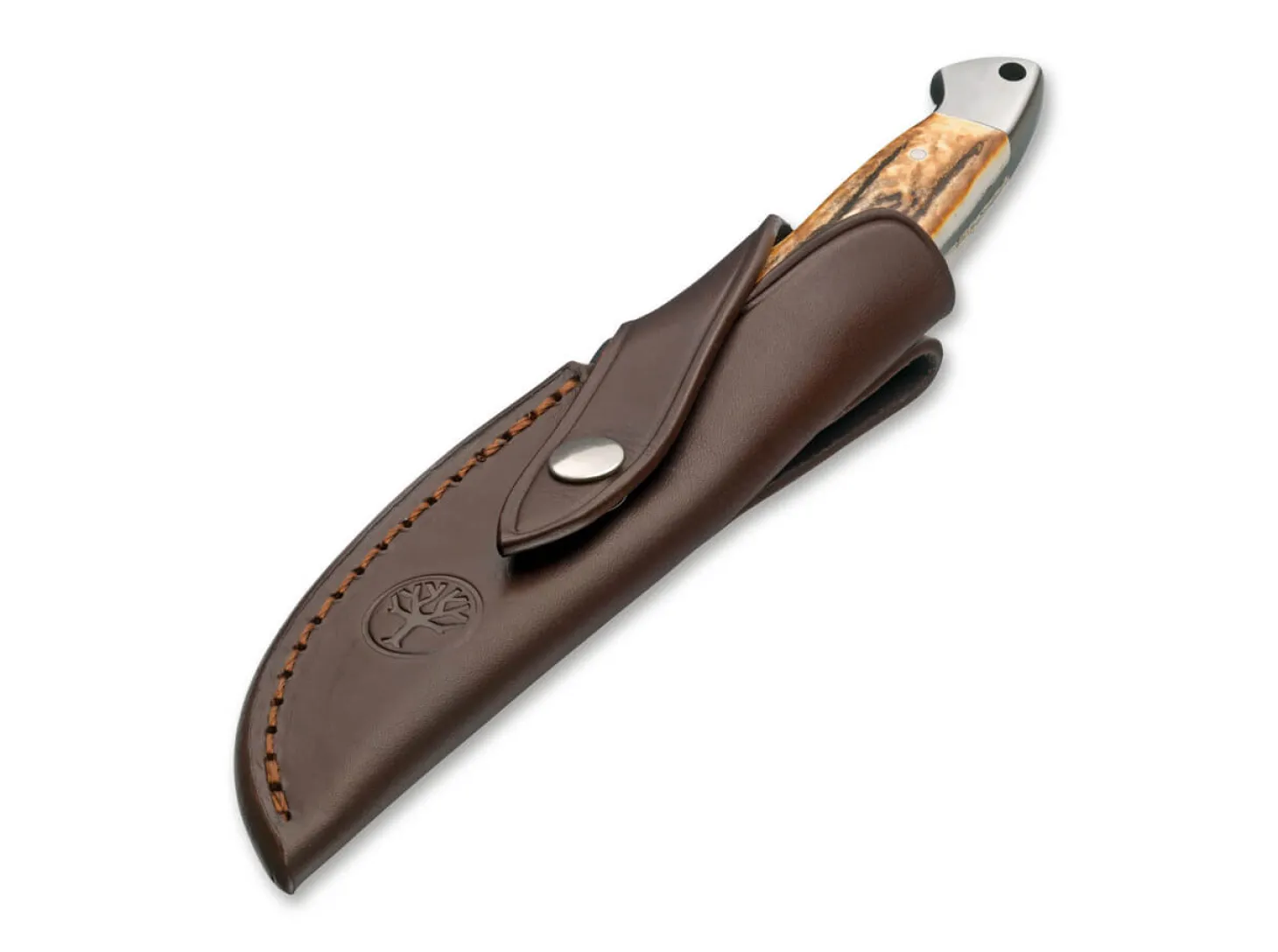 Seit vielen Jahren ist das Böker Vollintegral ein nicht mehr wegzudenkender Bestandteil unseres Sortiments, und gleichzeitig eine Ikone unter den Böker- Jagdmessern. Die stabile Bauweise des aus einem Stück Stahl gesenkgeschmiedeten Messers und die ausgezeichnete Ergonomie der durchdacht gestalteten Griffschalen haben schon Legionen von Jägern begeistert. Nun haben wir das Vollintegral in einigen Punkten weiter optimiert. So sind der Griff insgesamt sowie die Oberflächen an Parierelement und Knauf stärker gerundet, um einerseits die Handlage zu optimieren, und andererseits die Optik noch eleganter zu gestalten. Des weiteren werden die Griffschalen zur Minimierung von Fertigungstoleranzen präzisionsgefräst, um die Passgenauigkeit und die Ergonomie auf das höchstmögliche Niveau zu heben. Der Klingenschliff wird vom bisherigen Hohlschliff zur Steigerung der Stabilität auf einen Flachschliff umgestellt. Als Klingenstahl kommt nach wie vor der bewährte 440C zum Einsatz. Lieferung mit Lederscheide. Mit klassischer Beschalung aus Hirschhorn.
