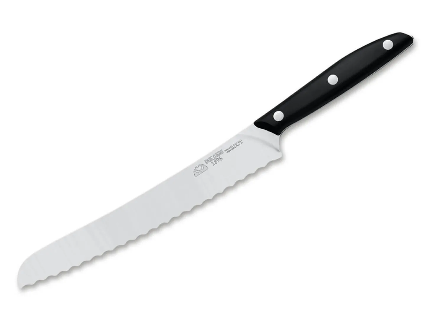 Mit der Serie 1896 stellt Due Cigni eine besonders hochwertige Küchenmesserserie vor, die das Sortiment des Herstellers aus der traditionellen Messerstadt Maniago krönt. Mit Griffen aus widerstandsfähigem POM liegen die Messer ausgezeichnet in der Hand, wobei die klassische Vernietung die optische und haptische Balance perfektioniert. Für die Klingen kommt der bewährte X50CrMoV15 zum Einsatz, der Schnitthaltigkeit und Korrosionresistenz perfekt vereint.Das Brotmesser zeichnet sich durch den speziellen Wellenschliff aus, sowie durch die sehr lange Klinge. Neben Brot lassen sich damit natürlich auch andere harte Lebensmittel besonders gut schneiden. Im Gegensatz zum klassischen Küchenmesser werden diese beim Schneiden mit dem Brotmesser nicht zerdrückt.