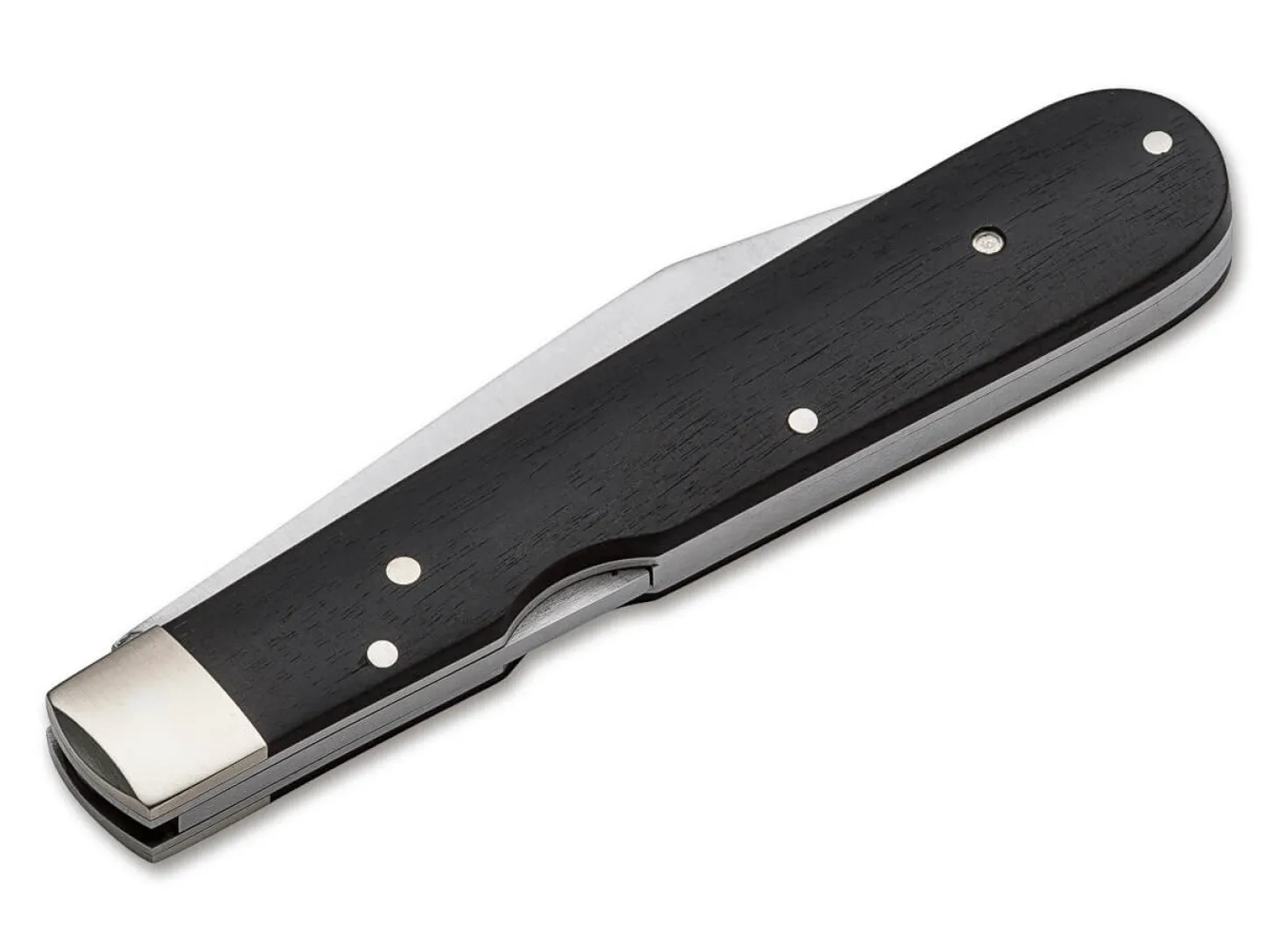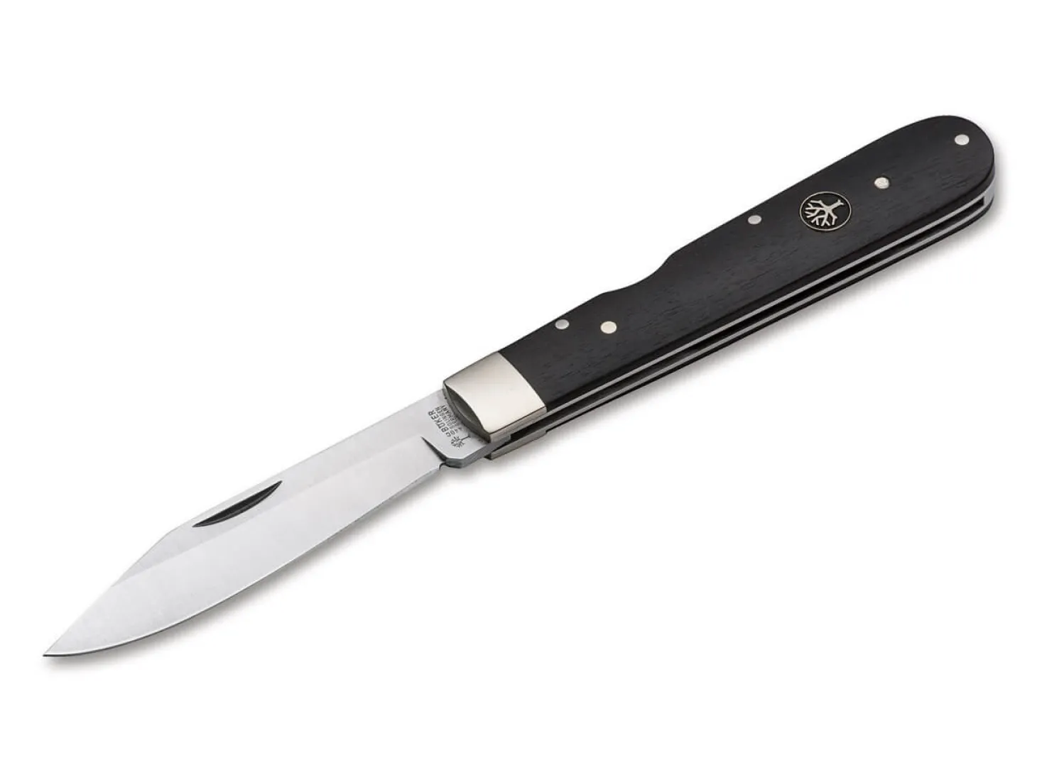 Manche Dinge unterliegen stark der Mode und verschwinden zu Recht im Dunkel der Geschichte. Andere wiederum sind viel zu schön, und zu schade, um dauerhaft verschwunden zu bleiben. So geht es uns mit dem klassischen Böker 1906. Die klare Linienführung dieses über ein Jahrhundert alten Entwurfes begeistert uns auch heute noch, und so haben wir keine Mühen gescheut, das Modell 1906 wieder ins Leben zu rufen. Da weder alte Werkzeuge noch alte Muster oder technische Zeichnungen existiert haben, mussten wir bei Null anfangen und das Messer von Grund auf neu entwickeln, wobei wir uns aber durchgehend an traditionellen Techniken orientiert haben.So ist ein sehr charismatisches Taschenmesser neu entstanden, welches das Flair der Jahrhundertwende verströmt und nicht trotz, sondern gerade wegen seiner Geradlinigkeit und mit dem sehr typischen Klingenschliff eine ganz besondere Erscheinung ist. Ganz klassisch sind die Platinen aus Messing gefertigt, während die Backen aus Neusilber bestehen. Die Klinge wird aus 440C gefertigt und verriegelt per Rückenfeder. Griffschalen aus zertifiziert importiertem Ebenholz setzen zudem einen edlen Akzent.