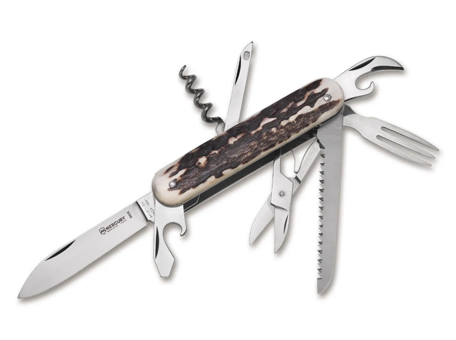 Das klassische Mehrzwecktaschenmesser 913-3AC von Mercury ist mit einer rostträgen Klinge aus 420er Edelstahl, einem Schraubendreher mit integriertem Kapselheber, einem Dosenöffner, einer Ahle, einem Korkenzieher, einer Schere, einer Säge und einer Picknickgabel. Zur Gewichtsersparnis sind die Platinen aus leichtgewichtigem, aber hochfestem Aluminium gefertigt. Als Griffbeschalung kommt Hirschhorn zum Einsatz. Das Slipjoint-Messer besitzen keinen mechanischen Verriegelungsmechanismus, stattdessen wird die Klinge im geöffneten Zustand allein durch eine am Ende des Klingenrückens befestigte Feder zurückgehalten. Wenn die Klinge wieder geschlossen werden soll, muss etwas Druck auf den Klingenrücken ausgeübt werden, um den Widerstand der Feder zu überwinden. Mit Fangriemenöse und Schlüsselring.