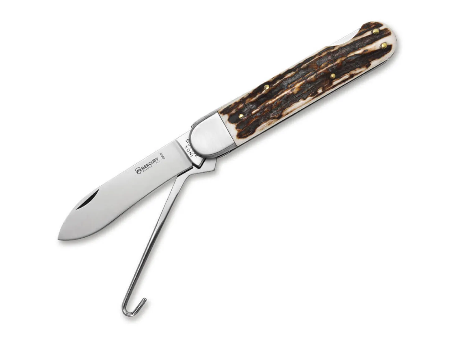 Das klassische Taschenmesser ist mit einer Klinge aus Z50CD15 ausgestattet, die per Nagelhau öffnet und mit dem sicheren Backlock verriegelt wird. Zusätzlich verfügt das Messer über einen praktischen Haken. Die Edelstahlbacken bilden einen gelungenen Kontrast zu den Messingnieten in den Griffschalen aus edlem Hirschhorn.
