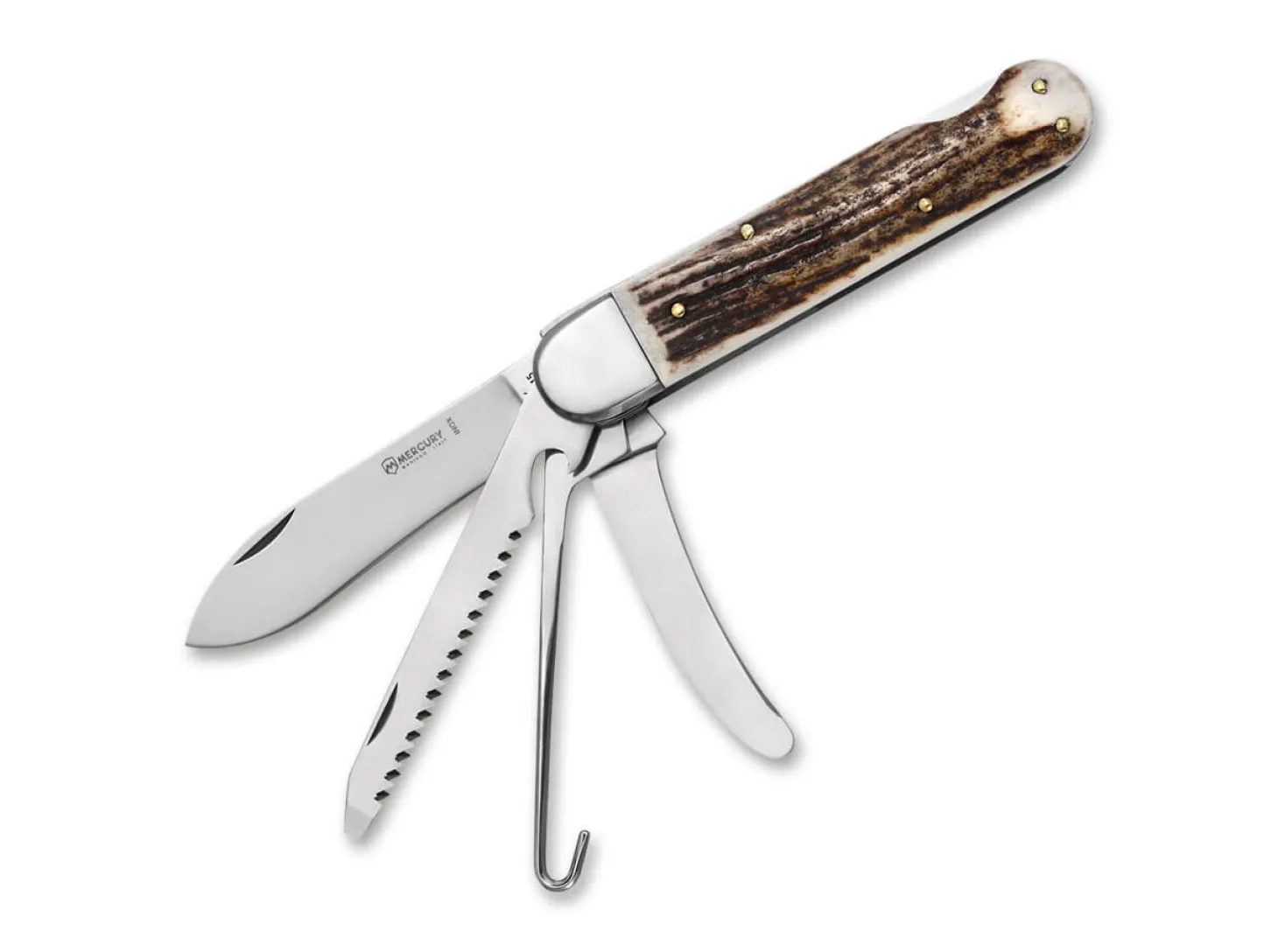 Das klassische Taschenmesser ist mit einer Klinge aus Z50CD15 ausgestattet, die per Nagelhau öffnet und mit dem sicheren Backlock verriegelt wird. Zusätzlich verfügt das Messer über eine Aufbruchklinge, einen Haken und eine Säge. Die Edelstahlbacken bilden einen gelungenen Kontrast zu den Messingnieten in den Griffschalen aus edlem Hirschhorn.
