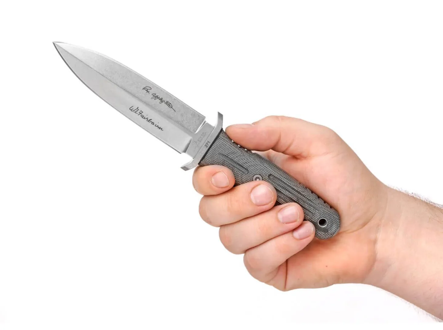 Kaum ein anderer Messermacher hat das Feld der taktischen Einsatzmesser so sehr geprägt wie William H. „Bill“ Harsey, seine Entwürfe haben ihm einen ausgezeichneten Ruf in der Messerwelt eingebracht. Die von ihm entworfene Modifikation des legendären Böker Applegate-Fairbairn verbindet das von vielen Eliteeinheiten im Einsatz genutze Messer mit modernen Elementen. Die größere Klingenbreite und die günstigere Geometrie der beidseitig geschliffenen Klinge aus N690 verbessern die Schneideigenschaften, während die Klingenlänge einen optimalen Kompromiss aus Führigkeit und Nutzwert bietet. Die Klinge und das Parierelement weisen ein widerstandsfähiges Stonewash-Finish auf. Der am Griffende hervorstehende Klingenerl kann unter anderem als Glasbrecher eingesetzt werden. Die gestrahlten Griffschalen aus Canvas-Micarta sind äußerst belastbar, angenehm strukturiert und bieten selbst bei Feuchtigkeit hervorragenden Grip. Lieferung mit hochwertiger Cordurascheide.