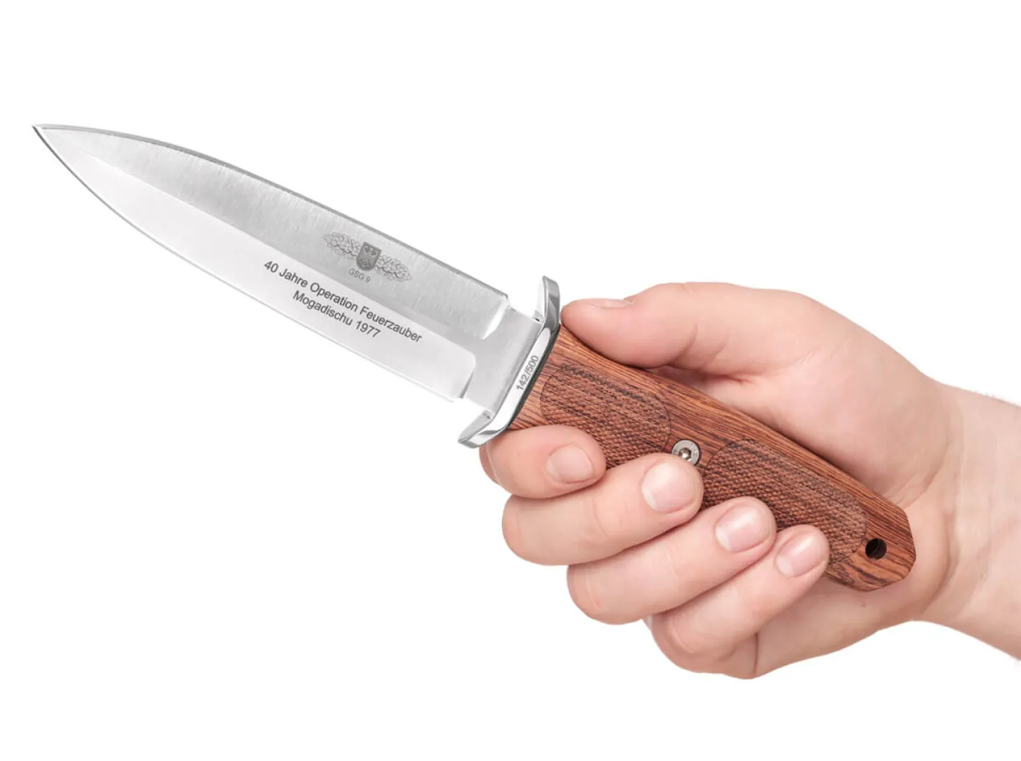 Im Herbst 2017 jährte sich die Befreiung der von Terroristen entführten Lufthansa-Maschine „Landshut“ in Mogadischu zum vierzigsten Mal. Durchgeführt wurde die Befreiungsaktion („Operation Feuerzauber“) von der damals noch recht jungen Einheit GSG 9, die sich, 1972 gegründet, mit diesem erfolgreichen Einsatz unter der Führung des Gründers Ulrich K. Wegener stark im Bewusstsein der Öffentlichkeit verankert hat. Und gerade in Zeiten wie den heutigen, in denen Terror fast schon allgegenwärtig zu sein scheint, kann einer Einheit wie der GSG 9 gar nicht genug Anerkennung und Hochachtung für ihren unermüdlichen Einsatz gegen Terrorismus und Schwerstkriminalität gezollt werden. Wir möchten die Einheit und ihre Mitglieder daher mit zwei Sondermodellen des A-F 4.5 und 5.5 ehren, die wir mit offizieller Genehmigung der GSG 9 auch mit dem Tätigkeitsabzeichen der Einheit, den berühmten Schwingen, versehen dürfen. Kaum ein anderer Messermacher hat das Feld der taktischen Einsatzmesser so sehr geprägt wie William H. „Bill“ Harsey, seine Entwürfe haben ihm einen ausgezeichneten Ruf in der Messerwelt eingebracht. Die von ihm entworfene Modifikation des legendären Böker Applegate-Fairbairn verbindet das von vielen Eliteeinheiten im Einsatz genutze Messer mit modernen Elementen. Um der Aktion auch eine Wirkung jenseits des Symbolischen zu verleihen, spendet Böker von jedem verkauften Exemplar 5 Euro an von der GSG 9 benannte wohltätige Organisationen. Ausgestattet sind die Messer mit einer fein satinierten Klinge und Edelstahlknebel, wobei die Schwingen der GSG 9 auf der Klinge verewigt werden. Der Griff wird aus zertifizerit importiertem Palisander gefräst und weist das charakteristische Rillenprofil für maximale Griffigkeit auf. Die Auslieferung erfolgt mit einer hochwertigen schwarzen Lederscheide. Limitiert auf 500 Stück weltweit und individuell nummeriert.