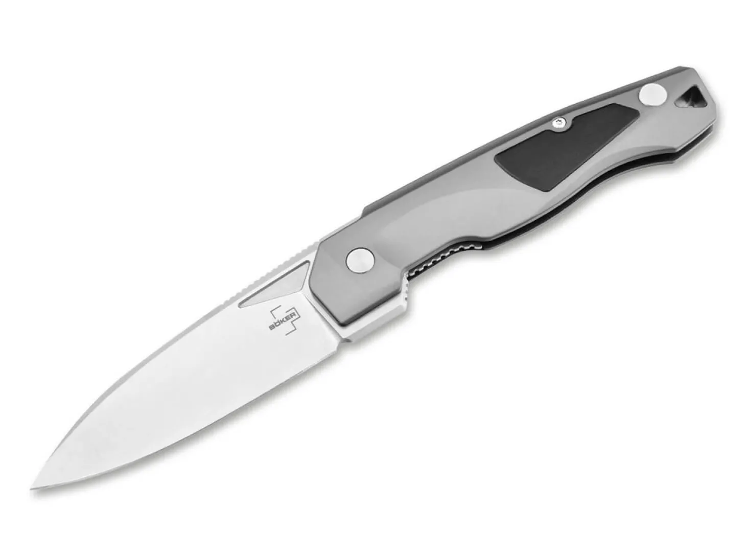 Das eindrucksvolle Böker Plus Aluma ist ein ausgewachsener Tactical-Folder, der von Eran Manasherov entworfen wurde. Der Sohn des israelischen Messermachers Boris Manasherov tritt mit seinen modernen Entwürfen in die großen Fußstapfen seines Vaters und überzeugt mit einer ähnlichen Kombination aus Praxistauglichkeit und taktischer Ausstrahlung.Das Taschenmesser ist mit einer kugelgelagerten Stonewash-Klinge aus D2 ausgestattet, die mit einem aufwendigen Schliffbild versehen ist und bequem per Flipper geöffnet wird. Ein stabiler Linerlock übernimmt die Verriegelung, während Riffelungen im Bereich der Daumenauflage die Arbeitssicherheit zusätzlich erhöhen. Der graue Griffkörper aus dreidimensional gefrästem Aluminium ist mit ergonomischen Fingermulden und einer edlen Holzeinlage versehen. Mit dekorativen Schrauben, Fangriemenöse und gefrästem Clip (Tip-up/r).