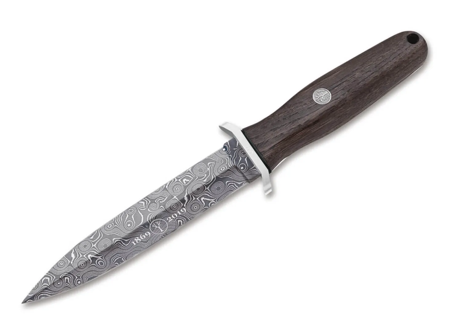 Das Böker Applegate-Fairbairn hat mittlerweile den Status einer echten Ikone erreicht und überzeugt in seinen verschiedenen Ausführungen seit Jahren Einsatzkräfte auf der ganzen Welt. Selbstverständlich darf es in der exklusiven Serie der Böker Dampfmaschinen-Damast Modelle daher nicht fehlen. Das stabile Messer wurde von Col. Rex Applegate entworfen, der während des Zweiten Weltkriegs geheime Operationen in ganz Europa koordinierte und sogar zur persönlichen Bewachung von Präsident Franklin D. Roosevelt eingesetzt wurde. Die Griffschalen bestehen aus geräuchertem Holz der heimischen Kastanie, die Klinge wird aus dem einzigartigen Dampfmaschinen-Damast gefertigt. Mit hochwertiger schwarzer Lederscheide. Handgefertigt in Solingen und streng limitiert auf 150 Exemplare weltweit. Die Auslieferung erfolgt mit individueller Seriennummer, in einer speziellen Jubiläumsverpackung und mit Echtheitszertifikat.