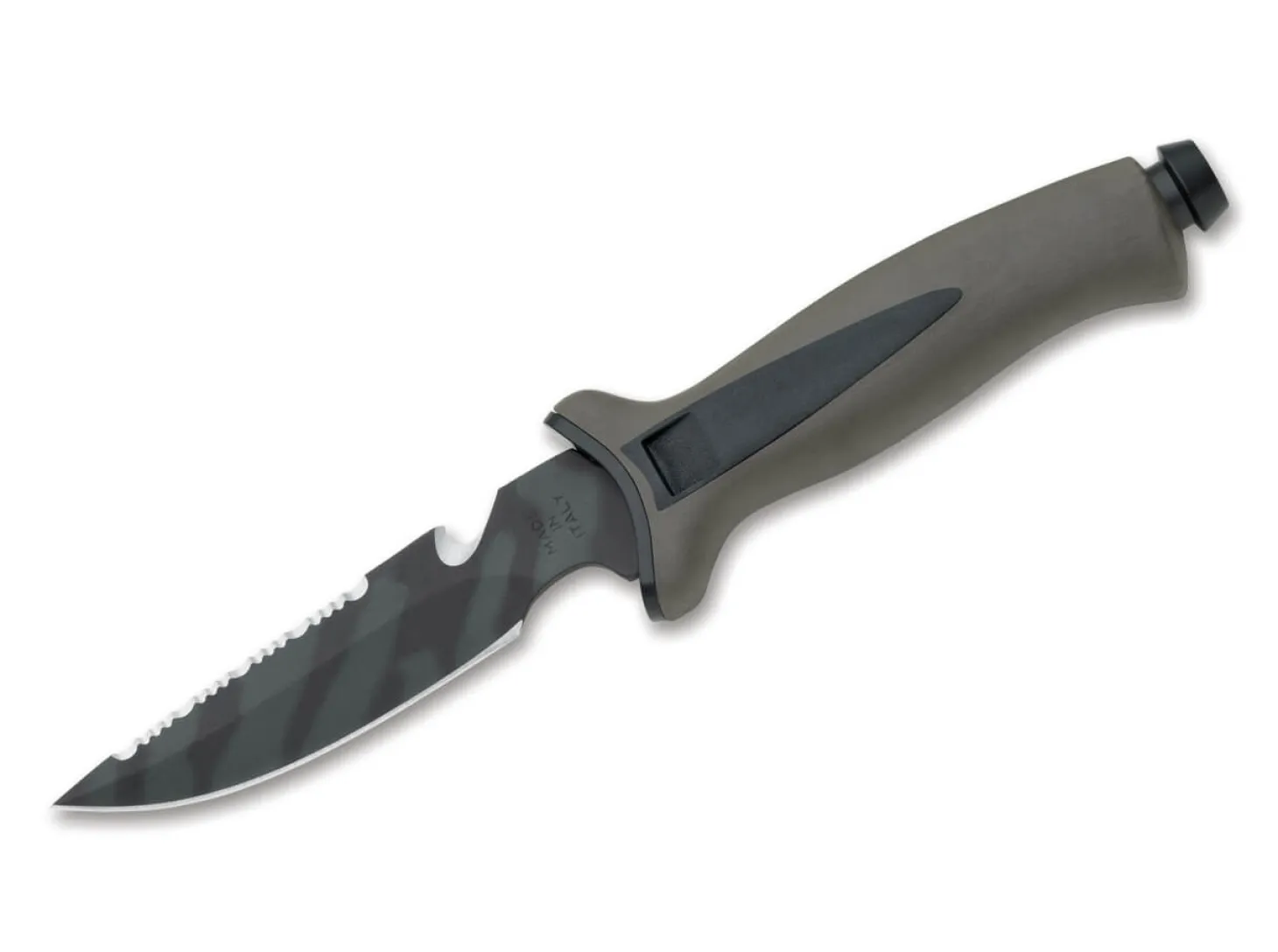 Das professionelle Tauchermesser Aquatys von MAC ist mit einer beschichteten Klinge aus 4116 ausgestattet. Zusätzlich verfügt die Klinge über einen bissigen Wellenschliff und einen Gurtschneider. Der olivfarbene Griff aus rutschfestem TPE liegt auch unter Wasser sicher in der Hand. Lieferung mit ABS-Scheide mit Gummibändern für Beine oder Arme.